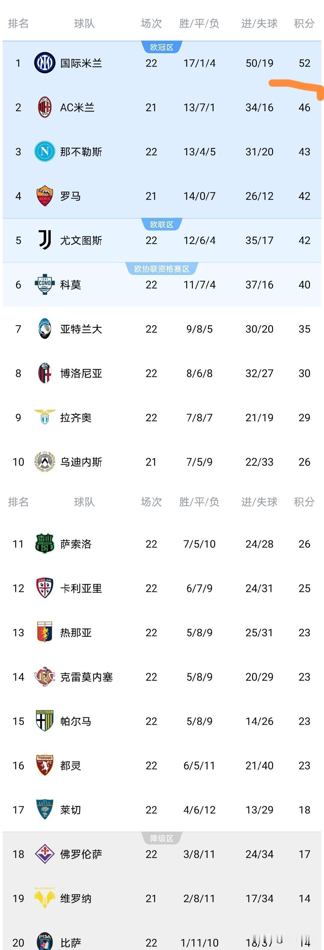 尤文赢了那不勒斯,科莫六球干翻都灵,争四乱成一锅粥。 国米52分遥遥领先,那不勒斯落后9分,AC米兰刚被罗马逼平,争冠基本没戏了。 尤文3-0赢球后冲到42分,排第五,但只比第四的罗马少1分,比第三的那不勒斯也只差1分。 科莫6-0都灵,直接拿到40分,现在排第四,比罗马就少3分。谁都没想到,这队去年还在打意乙,今年居然能卡在欧冠区门口。法布雷加斯带得挺狠,主场6场5胜1平,踢得又快又准。 那不勒斯输完这场,士气明显垮了。主力伤了7个,包括奥斯梅恩和克瓦拉茨赫利亚,轮换都凑不齐。罗马倒是没输,但赢得磕磕绊绊,主场被莱切逼平,靠点球才赢佛罗伦萨,进球全靠运气。 亚特兰大4-0帕尔马,进了35分,可离第四差8分。斯卡马卡进了5球,但后防总出错,16轮丢20球,遇到尤文、国米这种队就吃瘪。博洛尼亚输给热那亚后还剩30分,净胜球是-1,热那亚赢了他们后净胜球+3,差一分就可能被反超。 保级这边更乱。佛罗伦萨17分还在降级区里蹲着,丢了31个球,意甲最多。都灵、克雷莫内塞、帕尔马全是23分,三队卡在13到15名,下个月要互相踢,谁输谁可能就掉下去。热那亚也是23分,但净胜球比他们好,暂时喘口气。 射手榜上劳塔罗进了12球,第二名才8球。前12个队,只有他一个上双。不是大家踢得不好,是机会真难打出来——国米那场6个进球,4个来自左路传中和角球;尤文两个反击进球,全是对手后防失误后3秒内打完的。 那不勒斯、罗马、尤文、科莫,四队分差不到3分,后面还有16轮。欧战名额就四个,欧冠三个,欧联一个,四队抢三个直通名额。谁掉链子,谁就被挤出去。 萨索洛赢了克雷莫内塞,23分,净胜球比都灵他们高一点,暂时松了口气。但再输一场,可能立马被拉进来一起绞。 卡利亚里赢了佛罗伦萨,25分,离降级区8分,基本安全了。拉齐奥0-0莱切,29分,排第九,想进欧战得指望前面全崩。 第22轮踢完,没谁真稳了。国米看着领先多,可一输就可能被追;尤文刚赢强队,但锋线俩主力还在养伤;科莫势头猛,可没踢过真正硬仗。 足球这玩意儿,就是一分一分拼出来的。 赢了就涨分,输了就掉坑。 没那么多道理好讲。