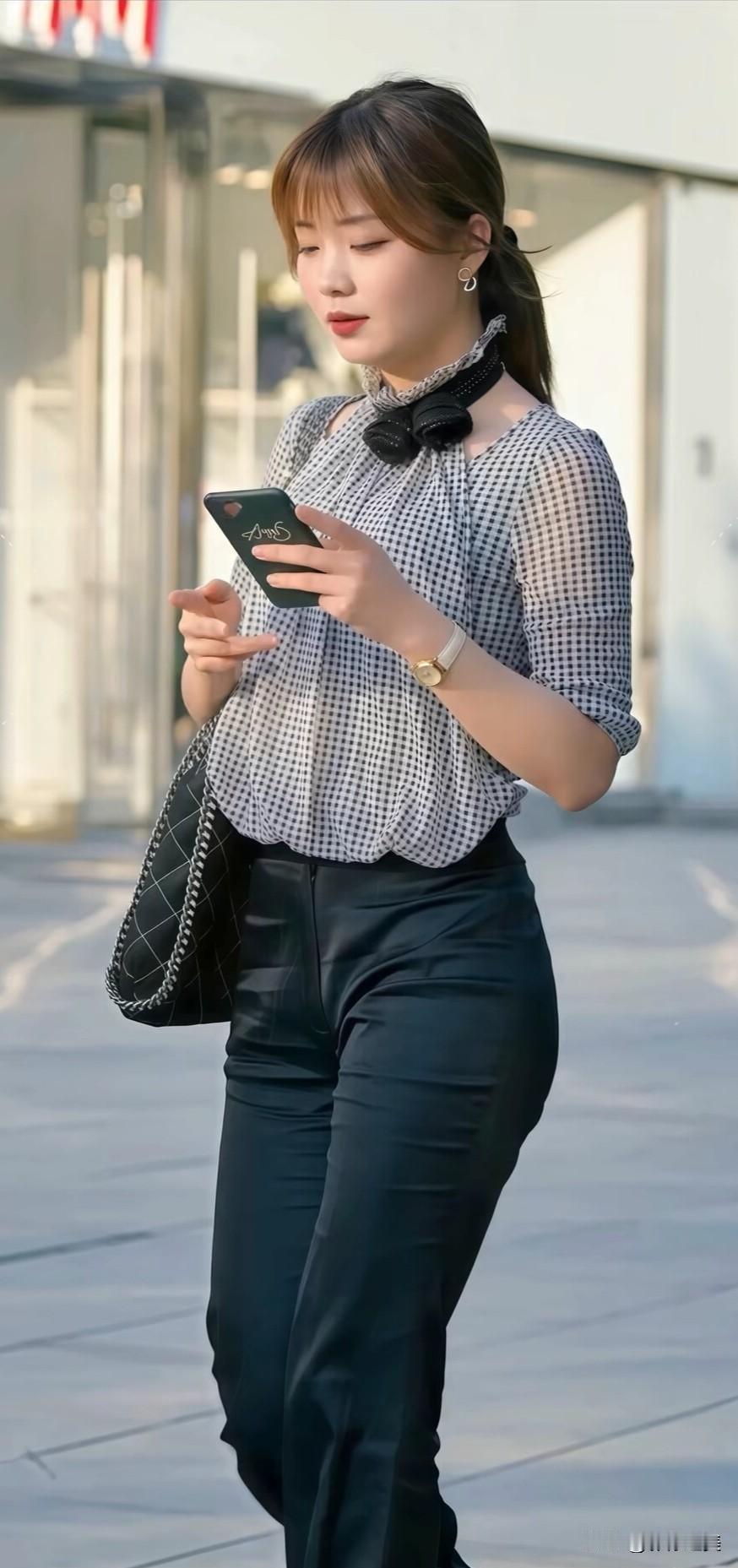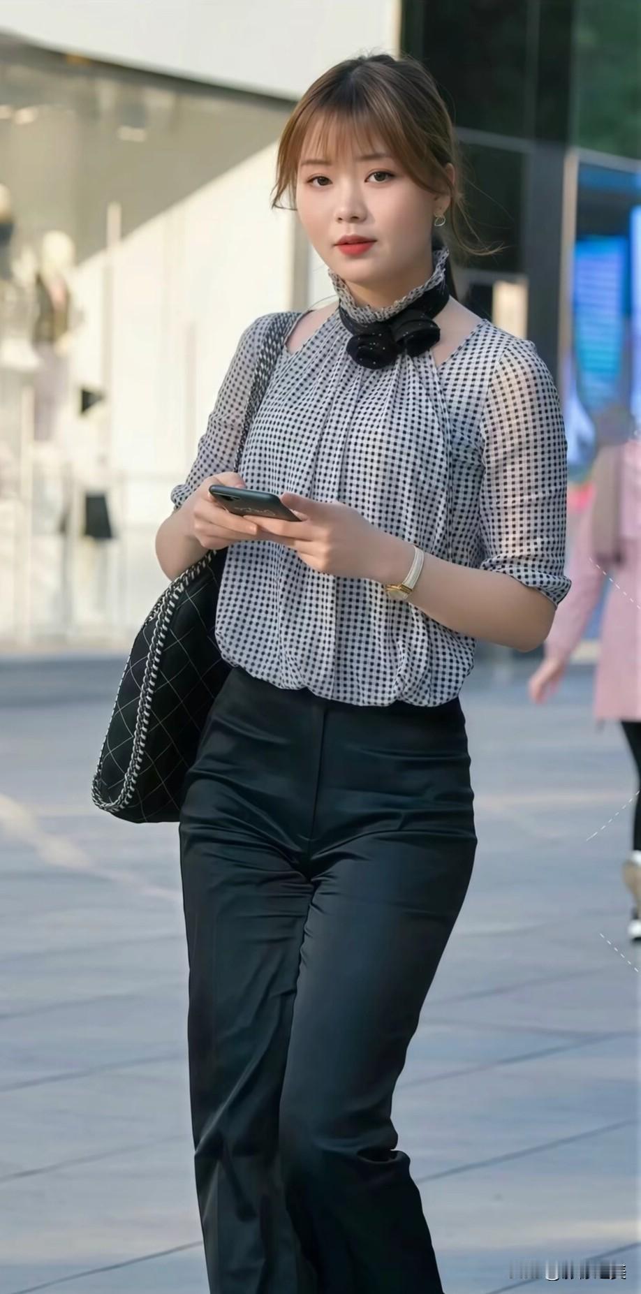 复古波点衬衫配缎面阔腿裤,再加上蝴蝶结领饰,通勤穿搭也能精致又有范儿~简约黑白调,高级感拉满。