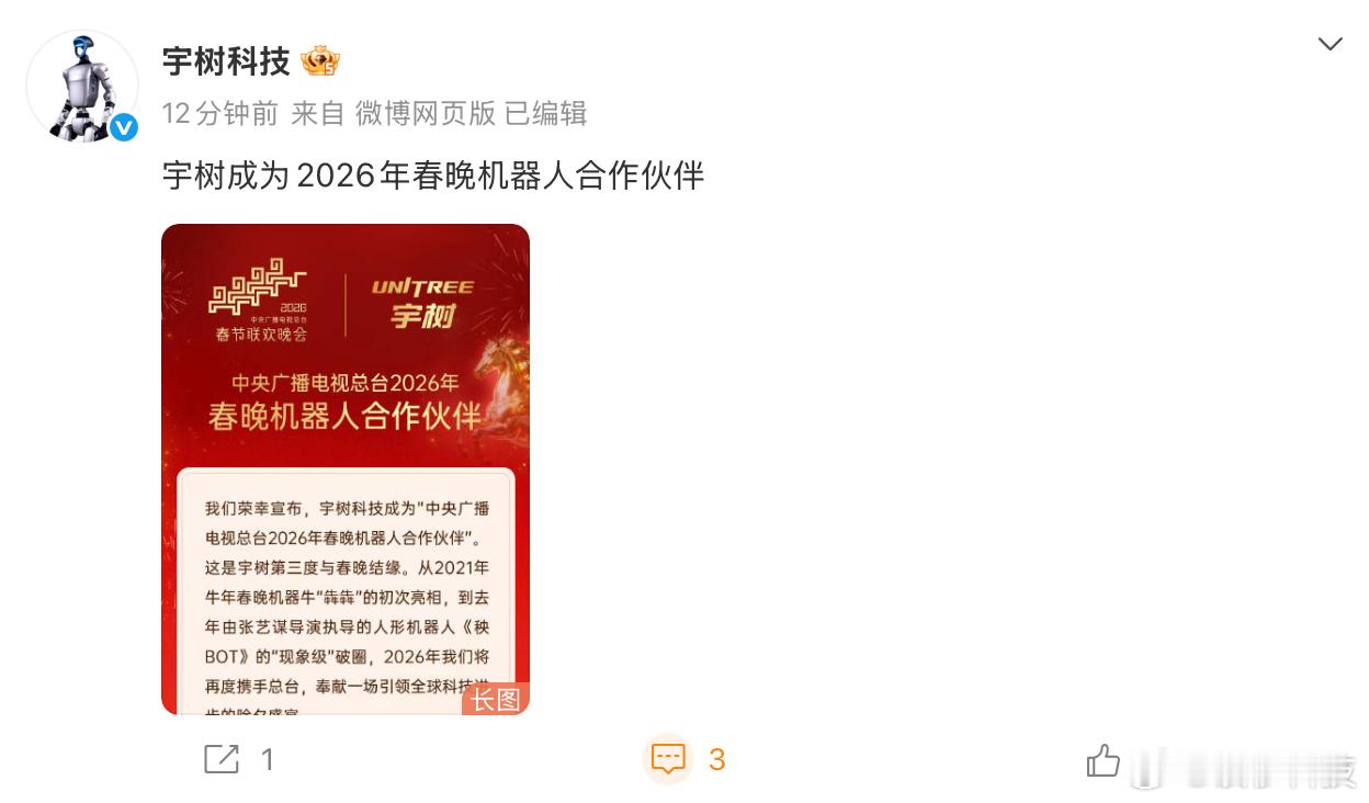 【宇树科技官宣成春晚机器人合作伙伴】宇树官宣成春晚机器人合作伙伴1月26日,官宣成为2026年春晚机器人合作伙伴。部分内容如下:我们荣幸宣布,宇树科技成为“中央广播电视总台2026年春晚机器人合作伙伴”。这是宇树第三度与春晚结缘。从2021年牛年春晚机器牛“犇犇”的初次亮相,到去年由张艺谋导演执导的人形机器人《秧B0T》的“现象级”破圈,2026年我们将再度携手总台,奉献一场引领全球科技进步的除夕盛宴。各位网友,您怎么看?