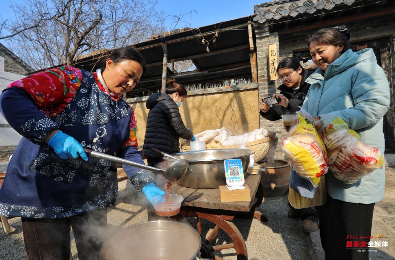 炊烟巷的柴火炉子上,浓稠香糯的腊八粥冒着热气,红枣、糯米、红豆等食材熬煮出满满的暖意。“咱熬的腊八粥用的都是自己种的五谷杂粮。材料配好后提前泡上半天,用文火慢熬,熬到米粒开花,豆子软糯,这才是咱泰安腊八粥的味儿。”泰山炊烟巷农家菜馆工作人员王翠珍笑着分享。除了腊八粥,包子铺前也排起了长队。一份份暖心年味套餐被陆续领走,在寒冷的冬天让游客品尝到了质朴的乡村美食。