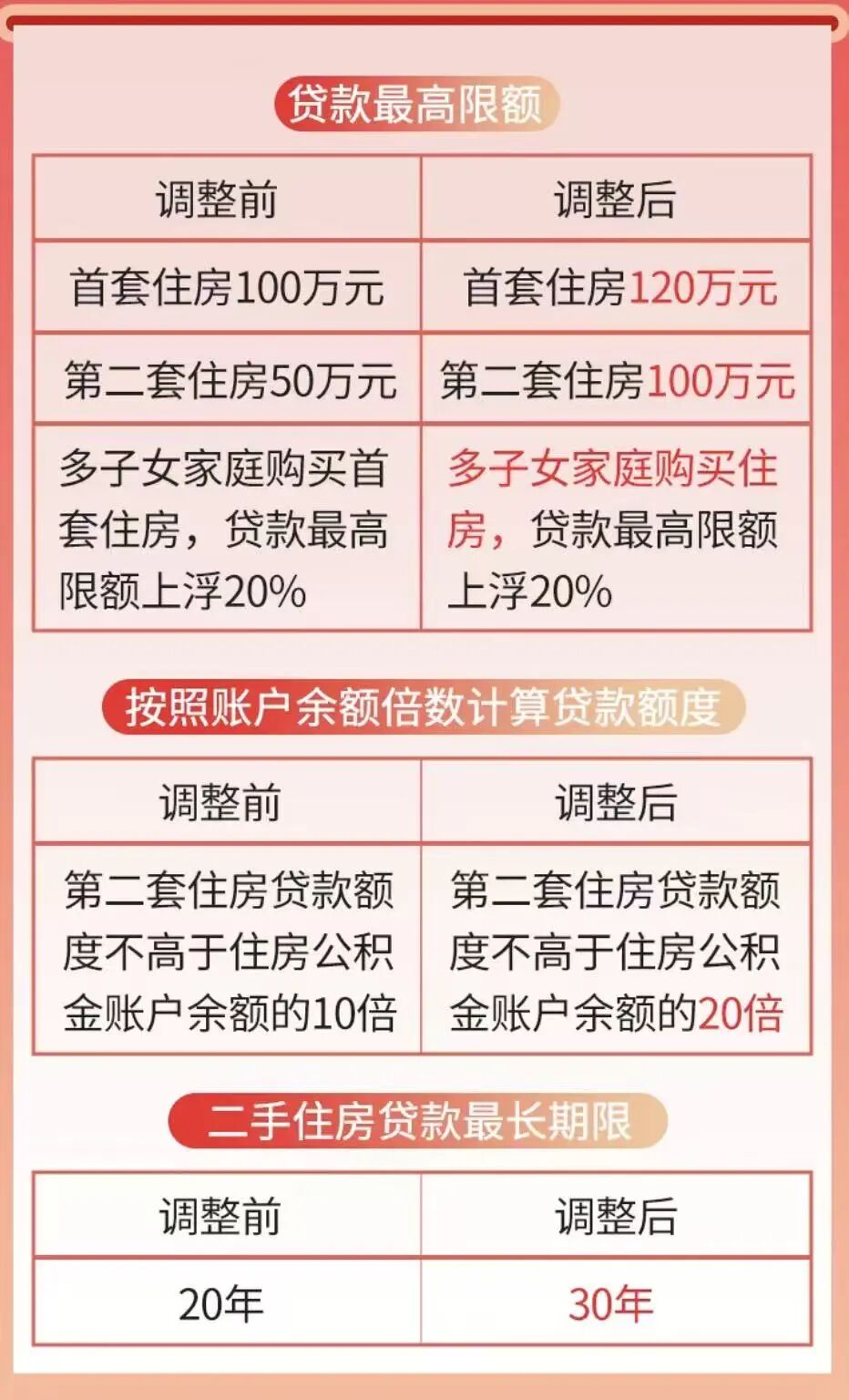 一是提高贷款最高限额。将首套、第二套住房贷款最高限额分别由100万元、50万元提高至120万元、100万元。养育两个及以上子女且至少一个子女未成年的,首套、第二套住房贷款最高限额分别由120万元、50万元提高至144万元、120万元。
