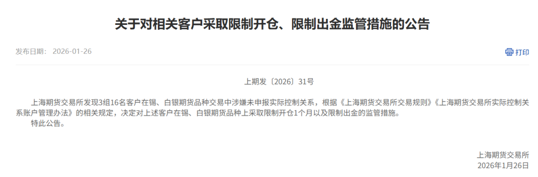 1月26日,上期所发布通知,根据《上海期货交易所风险控制管理办法》的有关规定,经研究决定,自2026年1月27日(即1月26日夜盘)交易起,非期货公司会员、境外特殊非经纪参与者、客户在白银、锡期货已上市合约的交易限额调整如下:白银期货AG2602、AG2603、AG2604、AG2605、AG2606、AG2607、AG2608、AG2609、AG2610、AG2611、AG2612、AG2701合约的日内开仓交易的最大数量为800手。锡期货SN2602、SN2603、SN2604、SN2605、SN2606、SN2607、SN2608、SN2609、SN2610、SN2611、SN2612、SN2701合约的日内开仓交易的最大数量为200手。实际控制关系账户组日内开仓交易的最大数量按照单个客户执行。套期保值交易和做市交易的开仓数量不受此限制。