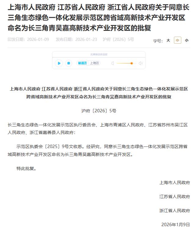1月23日,上海市政府网站发布一则批复,上海市人民政府、江苏省人民政府、浙江省人民政府同意“长三角生态绿色一体化发展示范区跨省域高新技术产业开发区”命名为“长三角青吴嘉高新技术产业开发区”。
