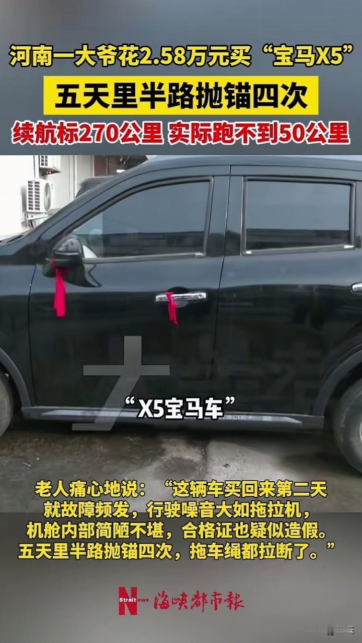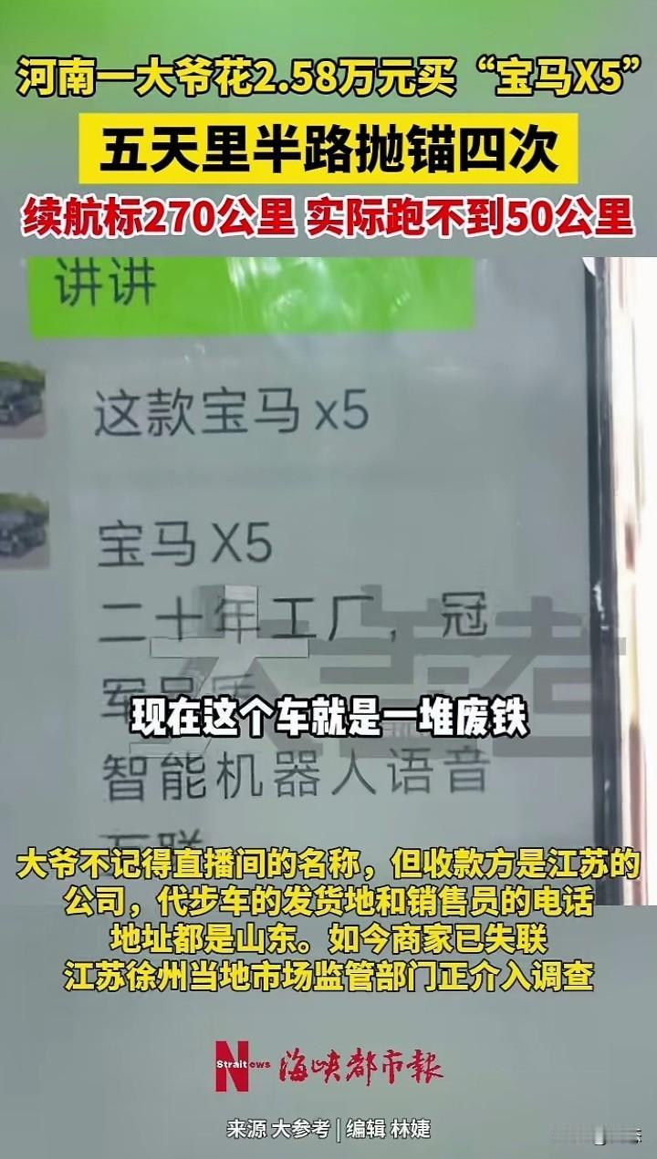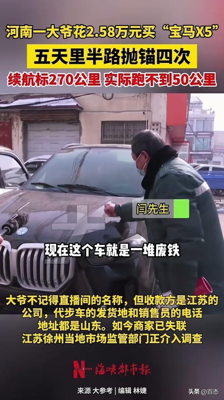 河南孟州一70岁的大爷在直播间看到有卖车的,大爷被“宝马x5”给吸引住了,而且价格还很便宜,大爷于是花了2.58万元,买了一辆“宝马x5”。 买回来后,大爷迫不及待的想开开新车,没想到五天里面这宝马x5半路抛锚了四次。大爷告诉记者称,商家称可以续航几百公里,实际上只有50公里。 大爷对于这车非常不满意,感叹到,这和废铁没什么区别。 面前有相关部门介入,如果虚假宣传还有欺骗消费者,这都是违法行为,必须严惩。 在这里提醒一下,在直播间买东西一定要到正规的平台购买,还有旗舰店买,那假货肯定很少。 你们怎么看呢?大爷在网上买车呢?