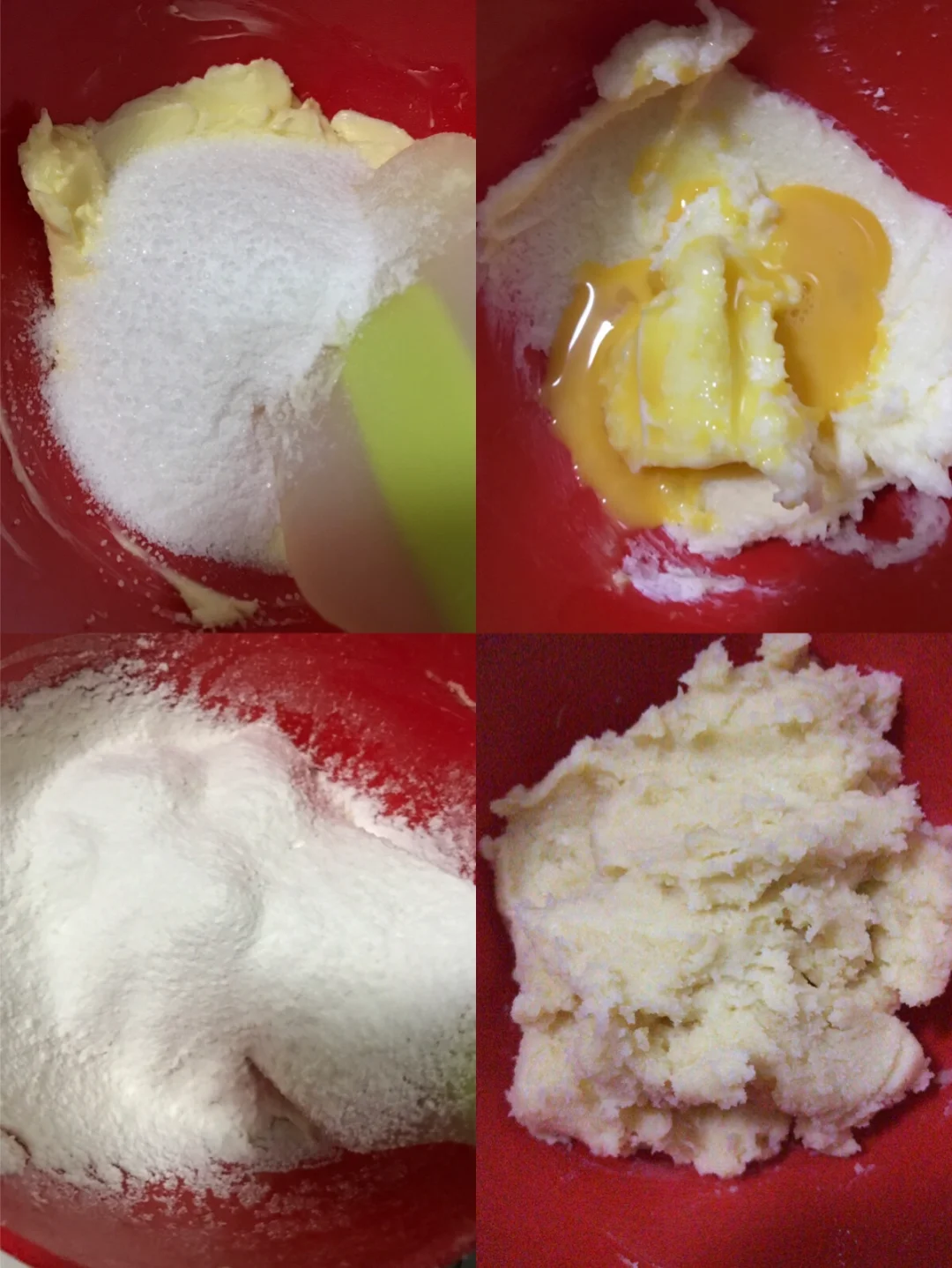 4️⃣开始做酥皮部分,软化好的黄油中加入糖粉混匀,加入鸡蛋液拌匀,筛入低粉、奶粉混匀,揉成团,放入冰箱冷藏10分钟。