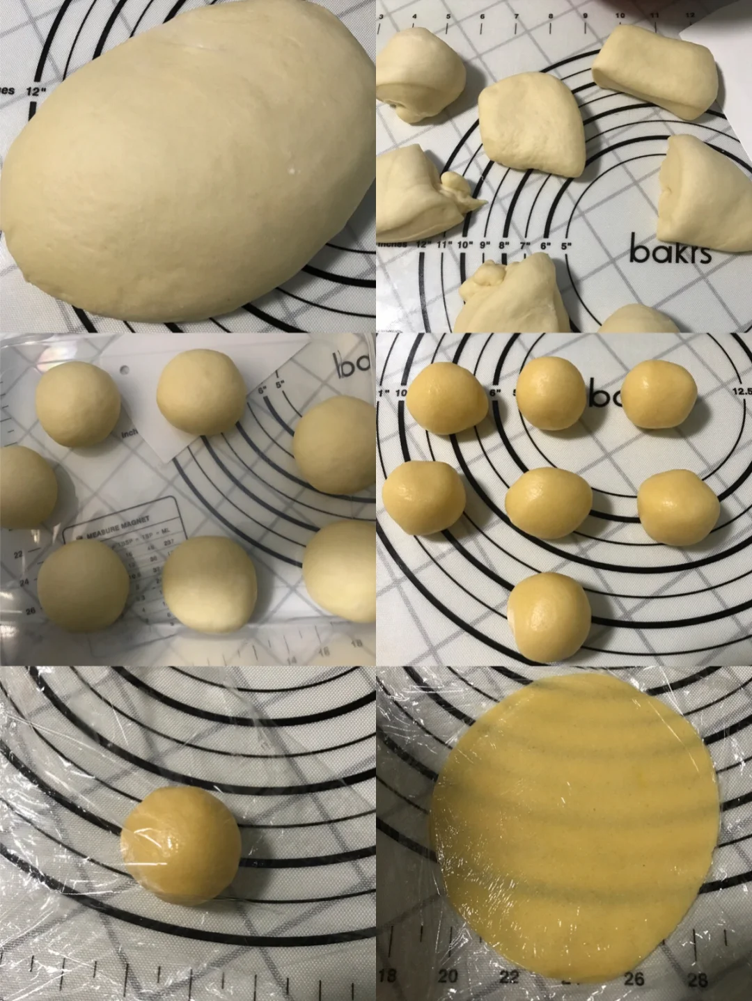 3️⃣取出发酵好的面团,轻揉排气,将面团分成大小均匀的小面团,滚圆盖保鲜膜松弛15分钟。