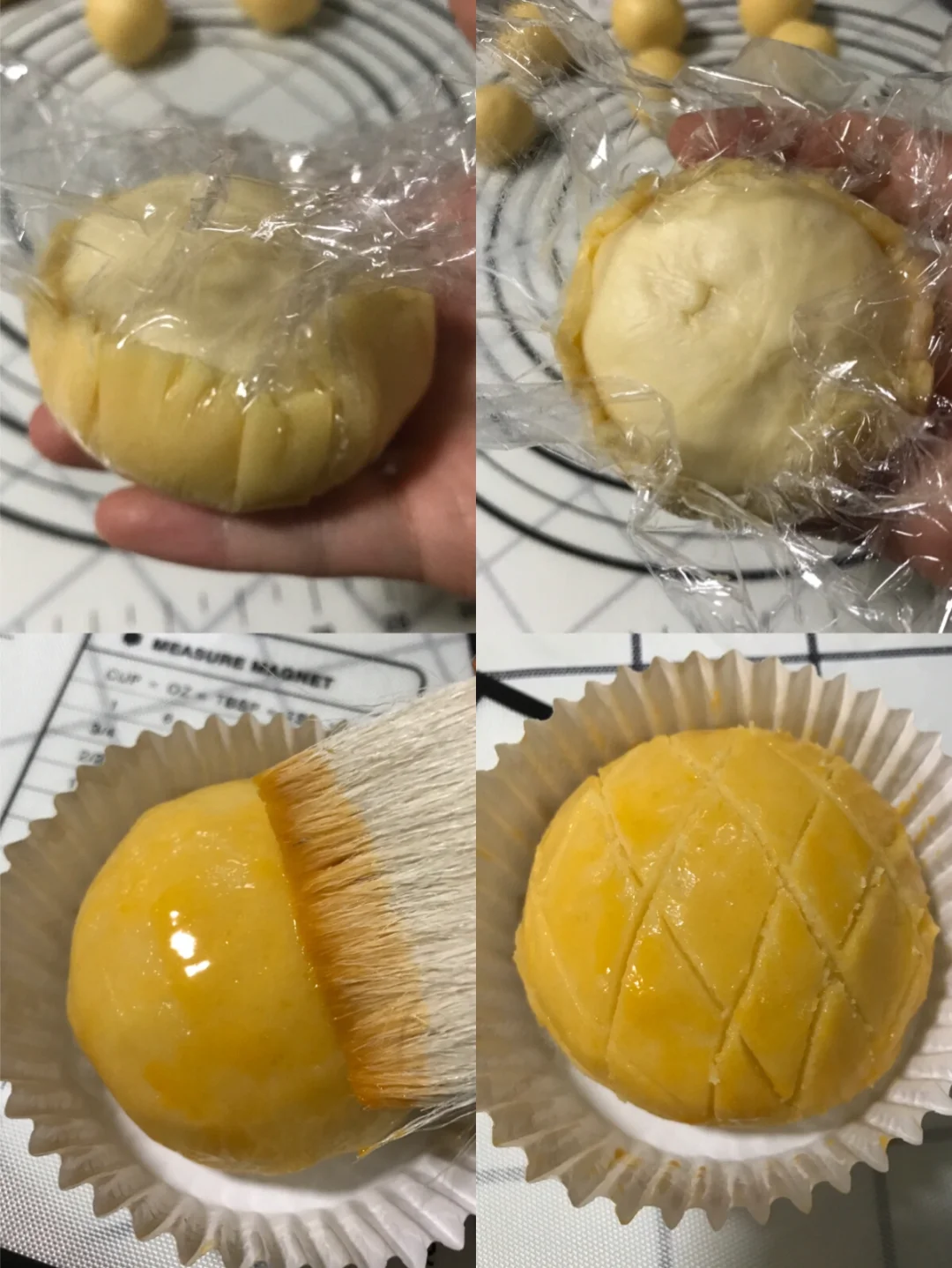 5️⃣拿出冰箱里的酥皮,均分成小面团(跟面包数量一致),取一个盖上保鲜膜,擀成圆形薄片,包在面团上,刷上蛋液,用牙签划出纹路。(要注意不要划到面包体了)
