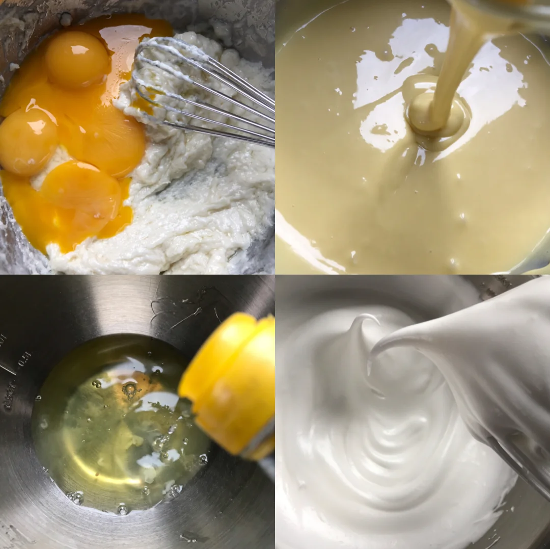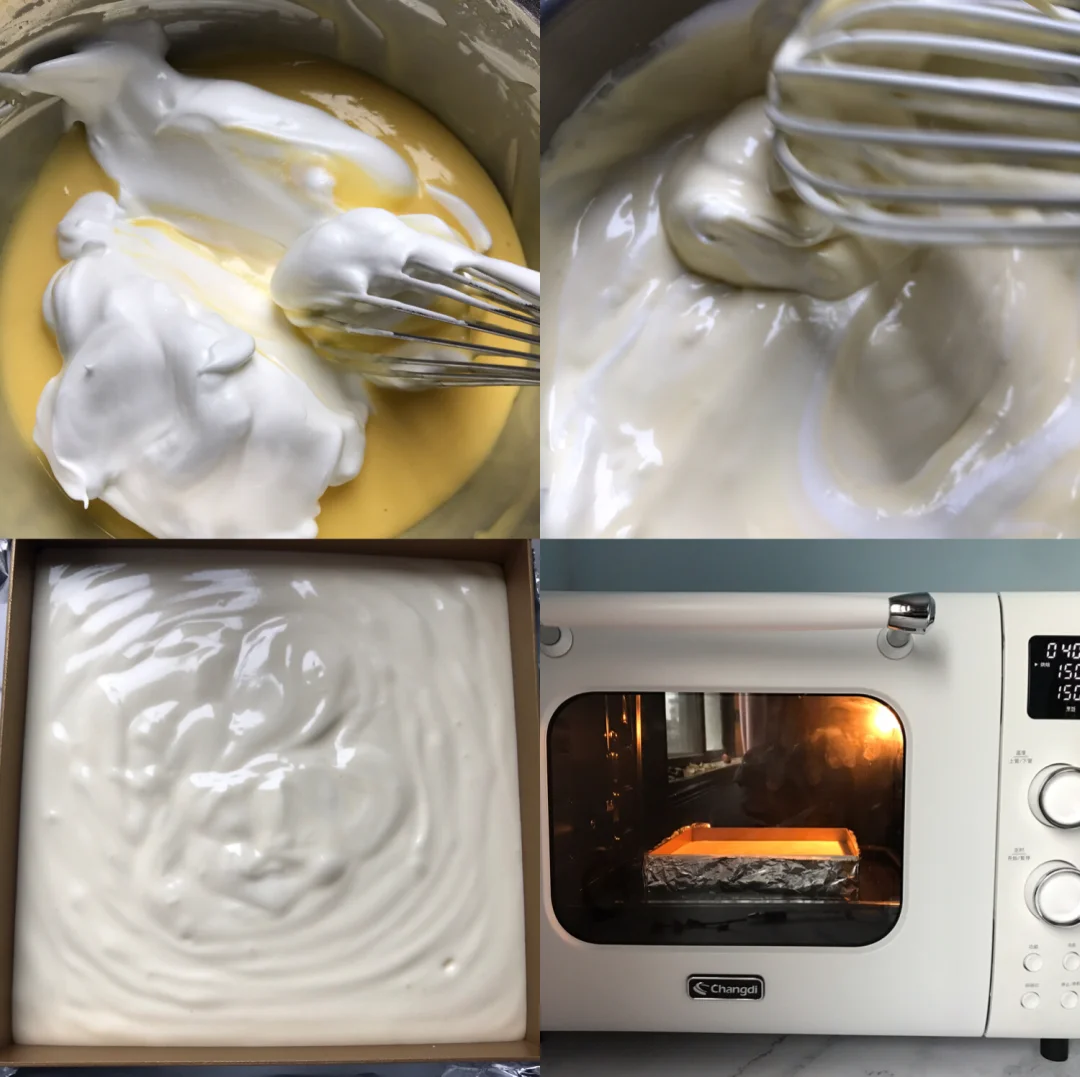 🌸将1/3蛋白霜加入到蛋黄糊中翻拌均匀,混匀后倒入剩余的蛋白霜中,翻拌均匀。