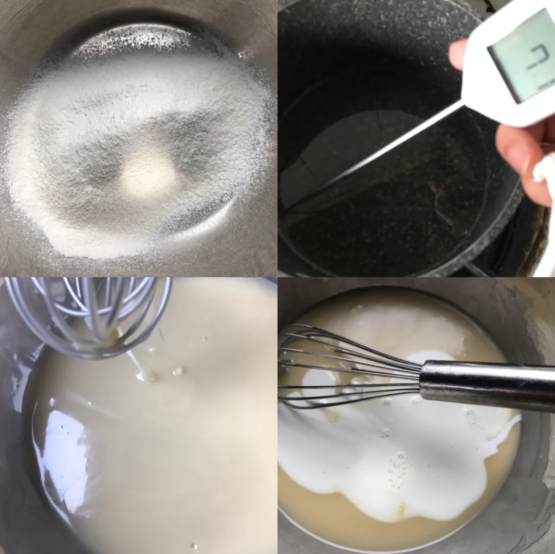 🌸玉米油加热至70度,放入过筛好的低粉,搅拌均匀。
