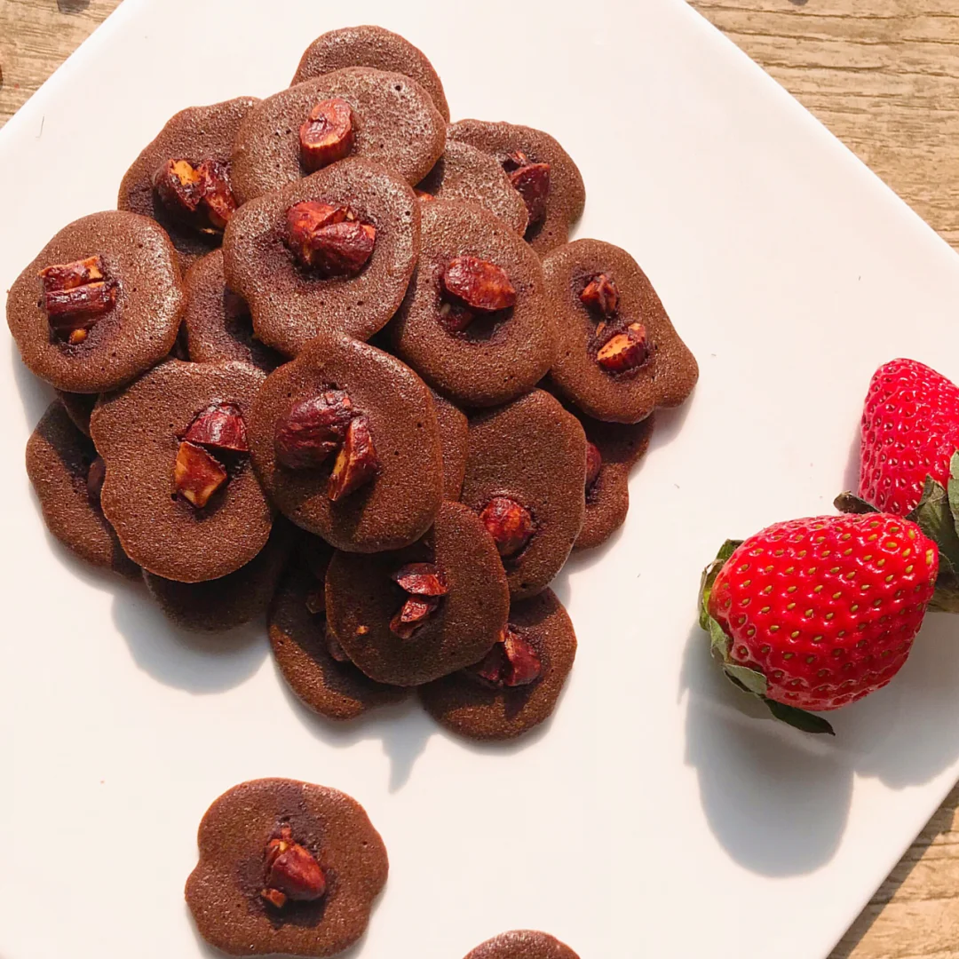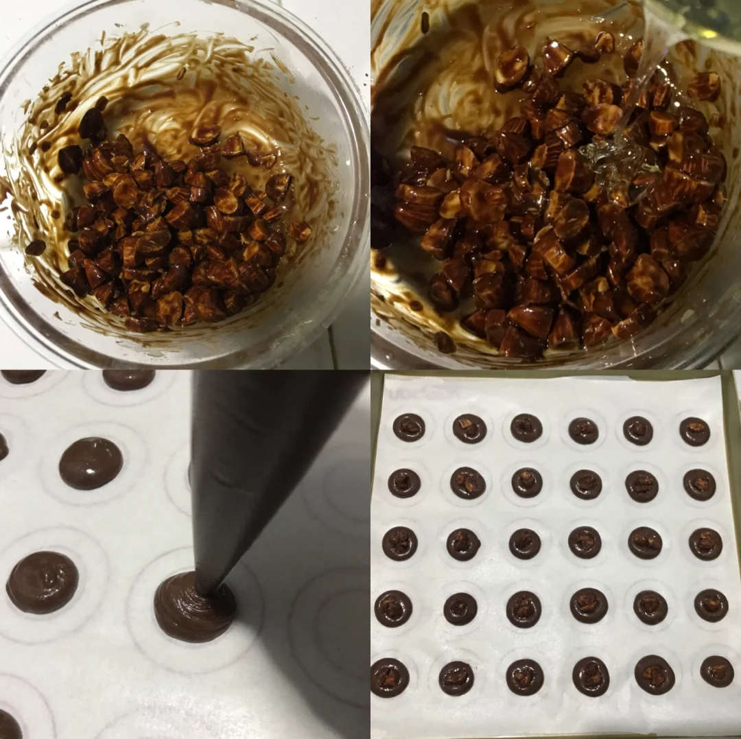 ❤️烤盘中垫入油纸,裱花袋剪一个小口,挤入面糊,每个面糊中间放一两颗坚果碎。