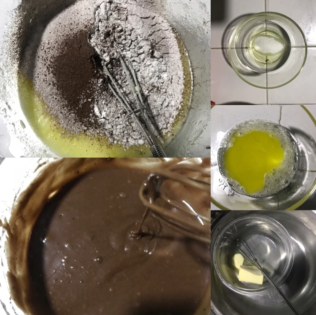 ❤️黄油(30g)隔热水融化,加入第一步混合好的面糊中,搅拌至顺滑无颗粒状态,装入裱花袋。