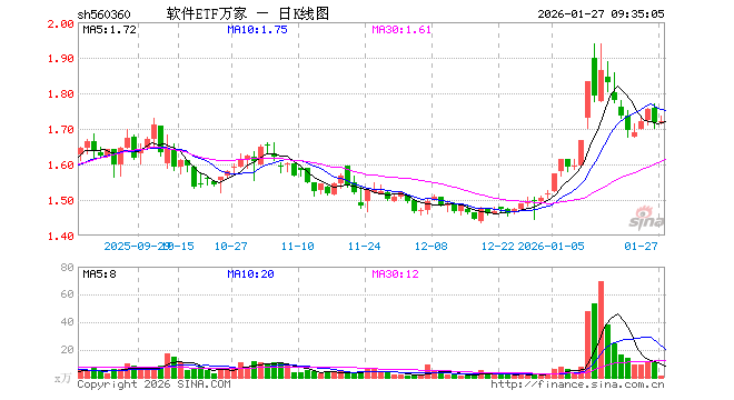 1月27日,软件ETF万家(560360)开盘涨0.06%,报1.718元。软件ETF万家(560360)重仓股方面,科大讯飞开盘涨0.48%,金山办公涨1.00%,同花顺跌0.15%,指南针跌0.70%,恒生电子涨0.87%,拓维信息跌0.21%,润和软件跌0.28%,三六零涨1.91%,软通动力涨0.12%。