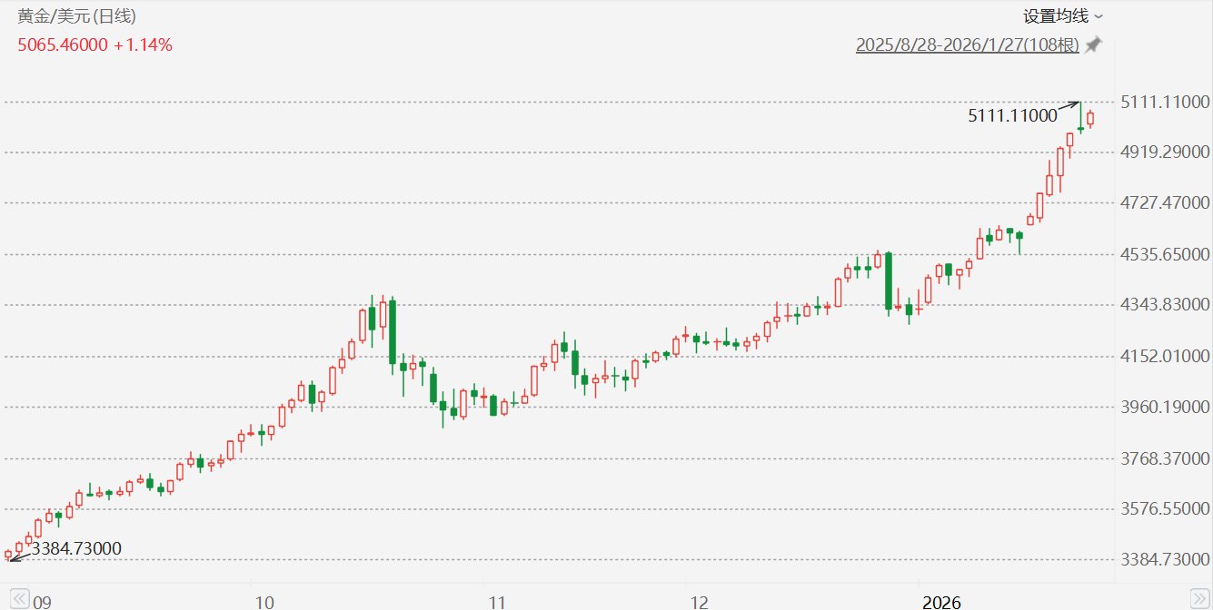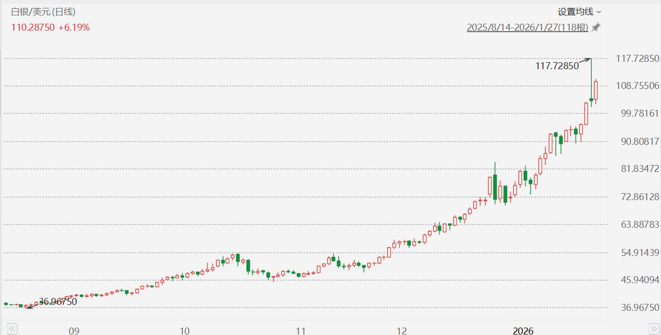 昨日盘中现货黄金一度升至5111.11美元/盎司,再创历史新高,虽之后有所回落,但今日涨势继续,目前价格维持在5065美元附近;现货白银昨日一度升至117.7285美元/盎司,创历史新纪录,岁之后回落,但今日继续上涨,目前稳定在110美元上方。