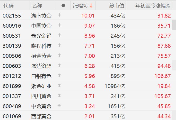 值得注意的是,湖南黄金、豫光金铅、晓程科技、招金黄金、四川黄金、盛达资源、西部黄金、紫金矿业、铜陵有色、中金黄金、湖南白银、山东黄金、山金国际、赤峰黄金、洛阳钼业盘中均创出历史新高。