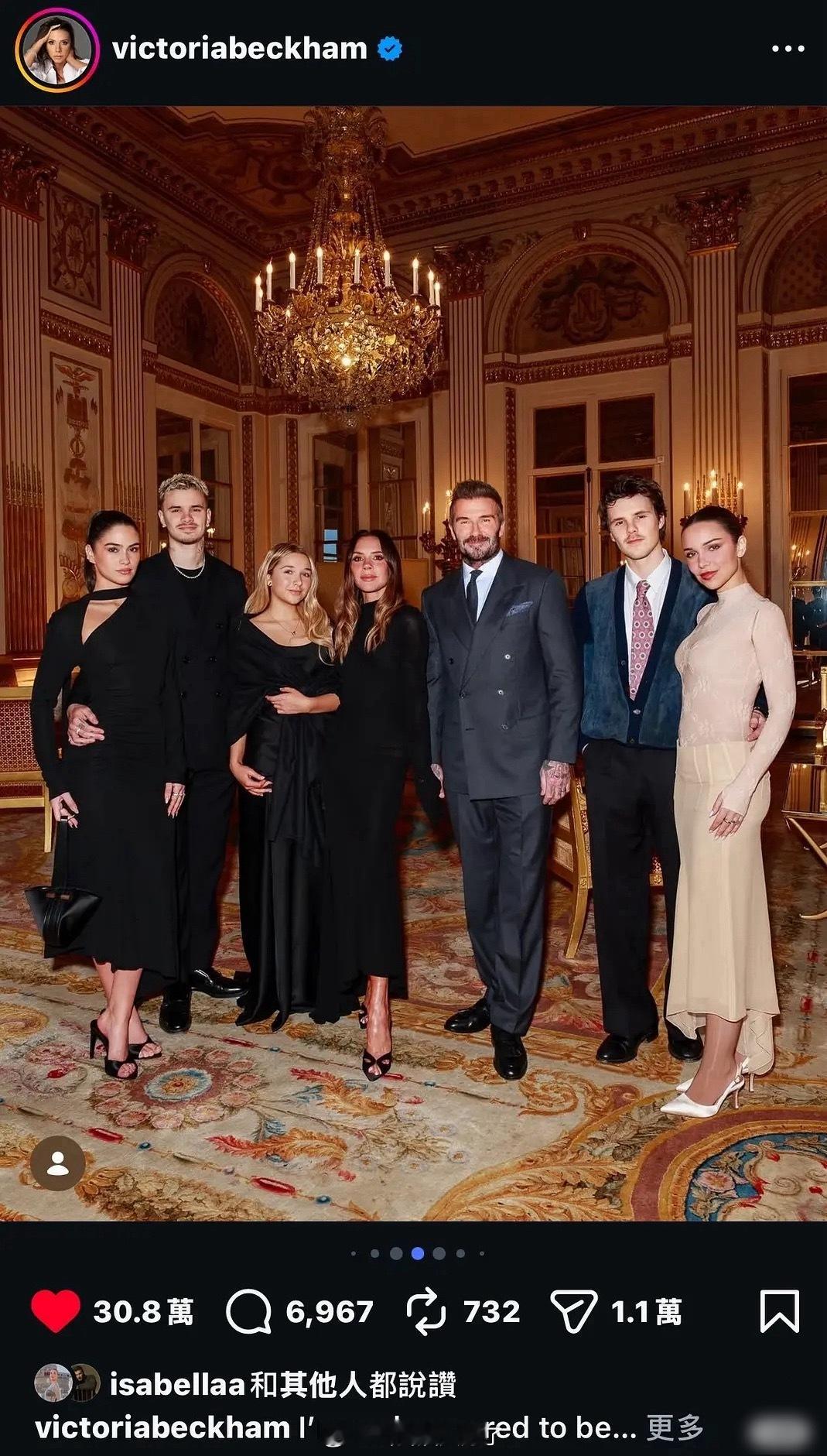 维多利亚在家庭风波后,首次发布家庭全家福照片。贝哥贝嫂,两个儿子带着女伴,以及小