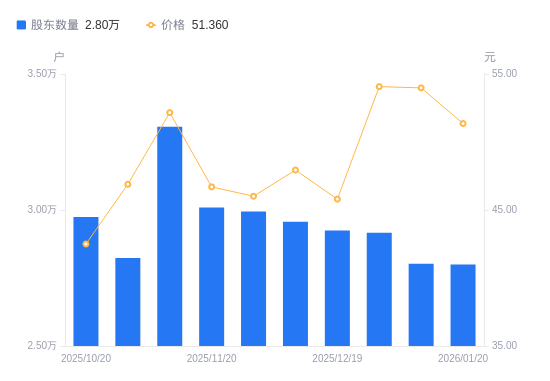 日期A股户数(户)流通A股户均持股数(股)户均持股市值(万元)2026-01-20279996515.4233.462026-01-09280266509.1435.142025-12-31291616255.7933.832025-12-19292446238.0428.572025-12-10295706169.2729.582025-11-28299466091.8128.032025-11-20300896062.8528.312025-11-10330615517.8428.782025-10-31282366460.7330.292025-10-20297446133.1826.07