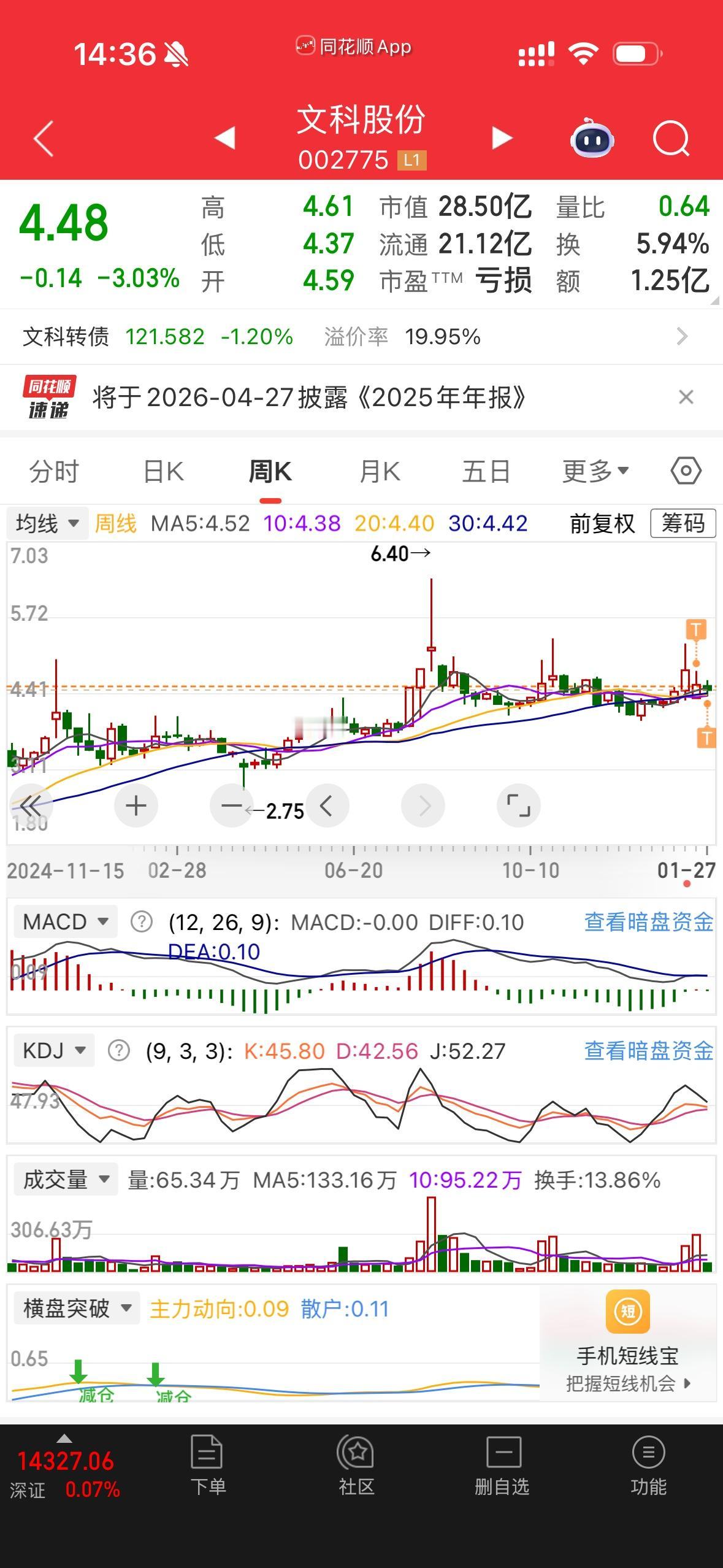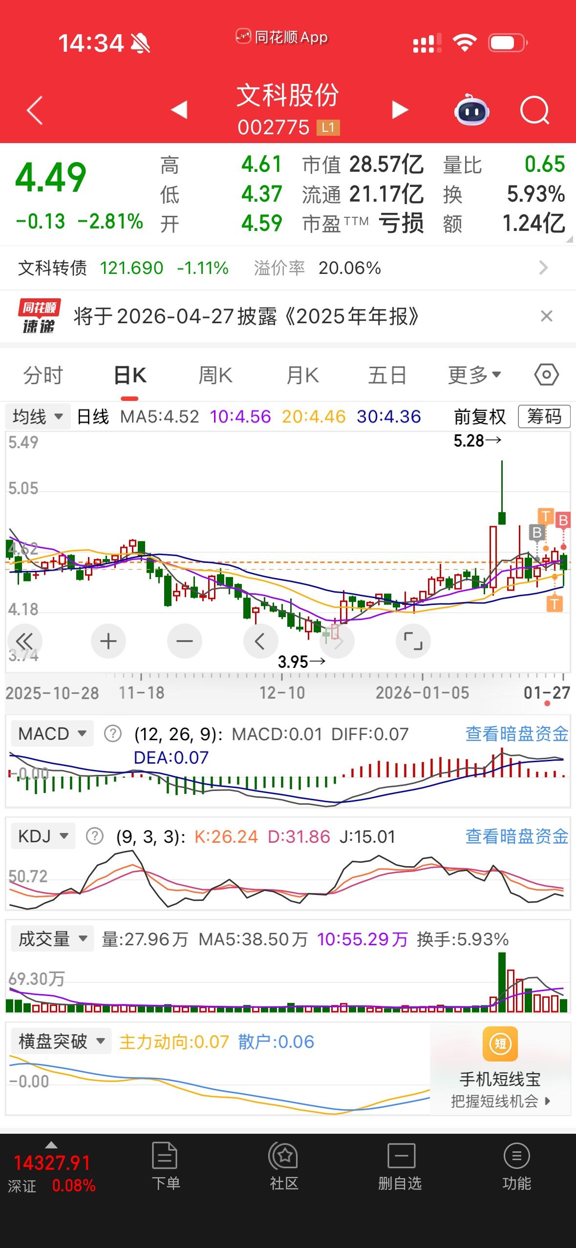 看看,什么是诱空手法? 从盘面特征来看,有诱空洗盘的一些典型迹象,可以从这几点来分析: 1. 分时走势特征 • 早盘急跌后快速企稳:开盘后快速下探至4.37元(跌幅约5.4%),但并未持续杀跌,而是在低位震荡后逐步回升,符合诱空“快速砸盘、不深跌、不延续”的特点。 • 均价线跟随回升:下跌过程中均价线并未大幅偏离,随后股价逐步向均价线靠拢,说明抛压并未真正扩散,更像是主力刻意制造的恐慌。 2. 量能表现 • 下跌无量、企稳缩量:早盘急跌时并未出现放量,后续低位震荡时量能持续萎缩,说明散户恐慌抛盘有限,筹码并未出现大规模松动,符合洗盘时“无量下跌”的特征。 • 低位有承接:在4.37元附近出现了明显的买盘承接,且后续回升过程中量能温和放大,暗示主力在低位悄悄接筹。 3. 盘口细节 • 买盘支撑较强:五档买盘里,买1(4.48元)有2927手的大托单,买4(4.45元)也有1672手承接,说明下方支撑明确,并非真实的空头行情。 • 卖压并未持续放大:卖盘虽有挂单,但并未出现连续大卖单砸盘,更多是散户的恐慌性抛单,进一步印证了诱空的可能性。 综合判断 从分时走势、量能和盘口来看,这更像是一次诱空洗盘:主力通过早盘快速砸盘制造恐慌,清洗不坚定的浮筹,然后在低位承接筹码,为后续拉升做准备。 结合这张日K线图和之前的分时走势来看,一次典型的诱空洗盘,可以从这几个维度来确认: 1. 日K线位置与支撑 • 股价处于上升趋势中的回踩:从3.95元启动后,依托5日、10日、20日均线稳步上行,当前回调并未跌破20日均线(4.46元),且30日均线(4.36元)在下方构成强支撑。 • 关键位快速企稳:今天最低下探到4.37元,刚好在30日均线附近获得支撑,随后快速回升,符合诱空“假破位、真承接”的特征。 2. 量能与筹码 • 缩量回调:今日成交量27.96万,明显低于5日均量(38.50万),说明下跌过程中抛压很轻,并非主力出货。 • 低位筹码峰未松动:从日K线的筹码分布来看,3.95元附近的低位筹码峰依然密集,没有出现高位派发的迹象,表明主力仍在控盘。 3. 技术指标配合 • MACD:仍处于金叉后的多头区间,绿柱未明显放大,说明上升动能并未衰竭。 • KDJ:虽处于回调阶段,但J值(15.01)已进入超卖区间,随时可能出现反弹。 • 主力动向:主力动向指标依然为正,且散户动向数值较低,说明筹码进一步向主力集中。 4. 与出货的核心区别 • 出货通常是高位放量下跌+关键支撑位失守,而这里是低位缩量回踩+支撑位快速企稳。 • 今日的回踩更像是主力在拉升前,利用短期获利盘的兑现需求,主动清洗浮筹,为后续突破前高(5.28元)做准备。 综合来看,这次回调就是一次诱空洗盘,可以继续持有,等待后续拉升。 结合周K线图,完整分析一下这只股票的诱空逻辑和后续走势: 1. 周K线趋势结构 • 长期上升通道:从2.75元的低点启动后,股价依托10周、20周均线稳步上行,当前回调正好触及10周均线(4.38元),而该均线是前期多次回踩的关键支撑位,并未跌破。 • 前期压力位已突破:周K线已突破前期4.41元的横盘平台,说明趋势已经转强,此次回踩属于突破后的确认动作,而非趋势反转。 2. 量能与筹码特征 • 缩量回踩:本周成交量65.34万,明显低于5周均量(133.16万),说明下跌过程中抛压极轻,是典型的洗盘特征,而非主力出货。 • 筹码集中:周K线的筹码峰显示,低位筹码依然密集,没有出现高位派发的迹象,主力控盘度较高。 3. 技术指标信号 • MACD:周线MACD虽处于零轴附近,但并未形成死叉,绿柱也未持续放大,说明上升动能并未衰竭。 • KDJ:周线KDJ处于回调阶段,但J值(52.27)并未进入超卖区间,仍有反弹空间。 • 主力动向:周线主力动向指标为正,且散户动向数值较低,说明筹码进一步向主力集中。 4. 综合判断 从周K线来看,这次回调是上升趋势中的一次正常洗盘,结合日K线和分时图的诱空特征,可以确认主力正在通过回踩清洗浮筹,为后续突破前高(6.40元)做准备。