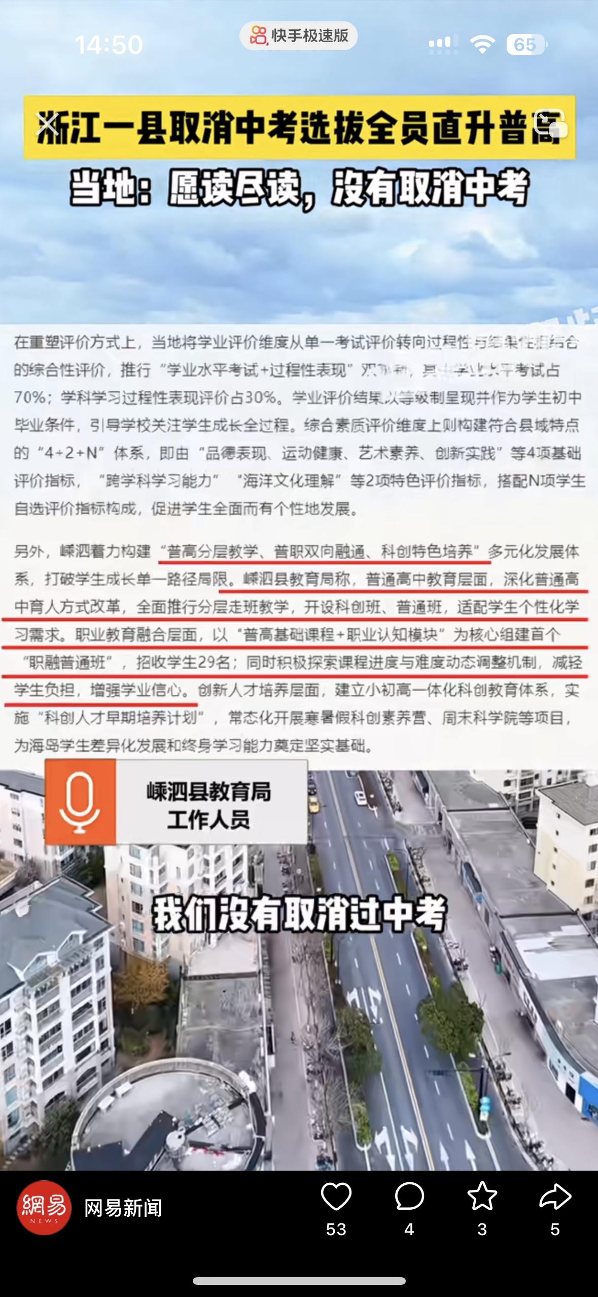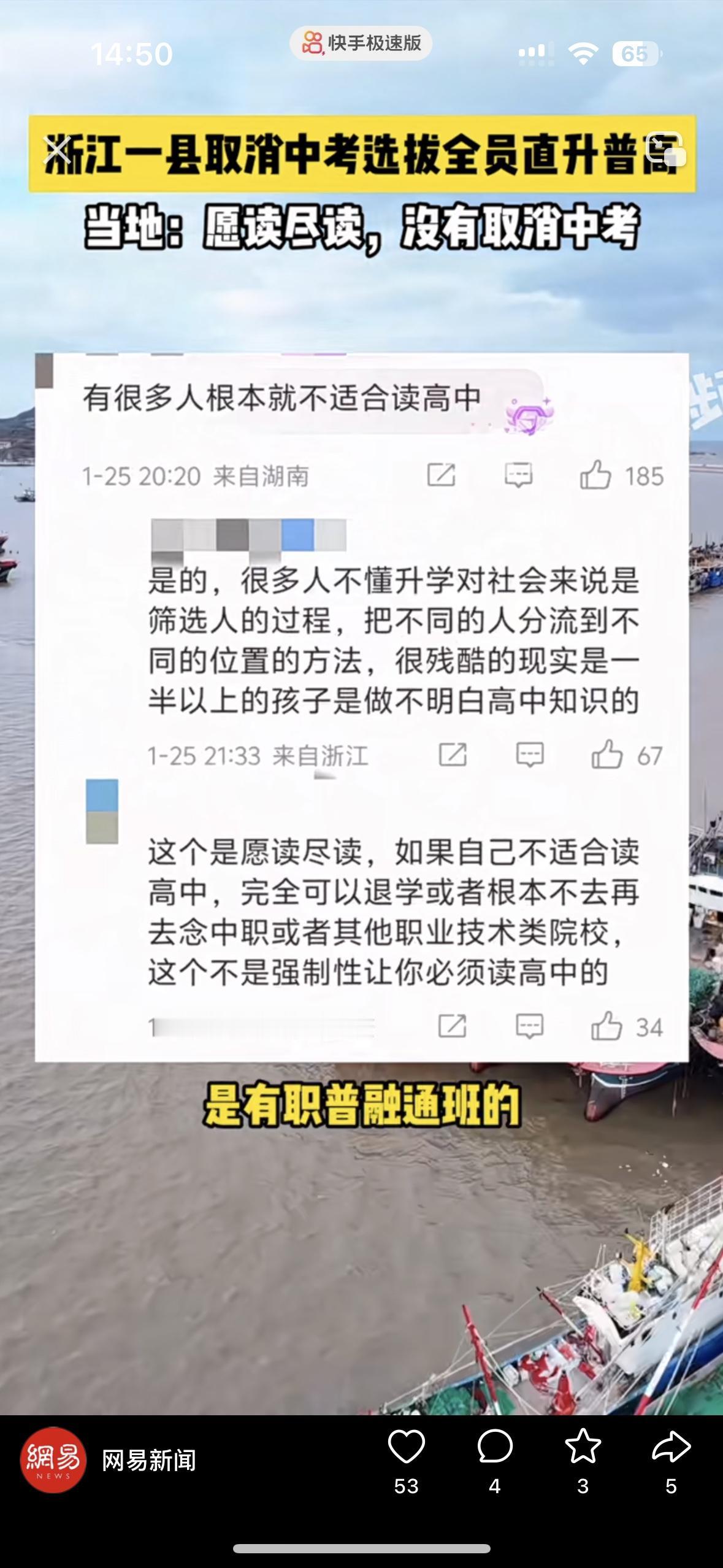 中考直接“保送”?浙江这波操作直接把家长看傻眼了 谁能想到中考还能这样呢!浙江嵊泗县直接放大招,取消中考选拔功能,本地娃不管成绩如何,想读普通高中就能读,简直是直接保送!这消息太好了,有家长高兴的拍手叫好,也有的家长泼冷水! 要知道以前这海岛的娃们,为了挤普高名额,熬夜刷题是常态,还有不少人背井离乡去外地求学,现在好了,户籍生和符合条件的随迁子女直接全员直升,学校还搞了分层走班、职普通融,不想走高考的路也可以走职教。 支持的家长松了口气终于不用逼孩子内卷了,也有人反对,基础差的孩子进普高跟听天书有啥区别,不仅如此,没准还影响学习好的同学,大家觉得好还是不好呢?