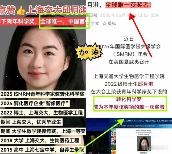 厉害了,我们的“零零后” 刚刚看到一个消息,说的是上海交大“零零后”女博士邱月淇,在美国夏威夷召开的“2025年国际医学磁共振学会年会”上获得了该项全球唯一的奖项…… 据介绍,邱月淇带领的团队,把制约我国核磁共振技术一下子提高了几个数量级,她们研制的便携式核磁共振仪,只有24寸大小,方便灵活,可以提供给基层医院完成核磁共振检查,结束了只有大型医院才能做核磁共振检查的历史! “零零后”,为你们加油点赞![赞][赞][赞]