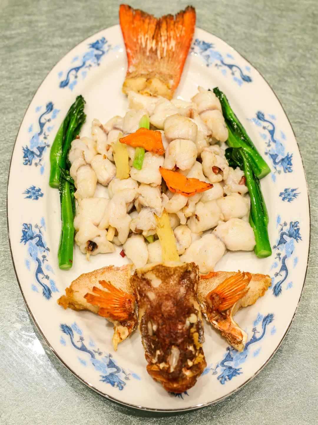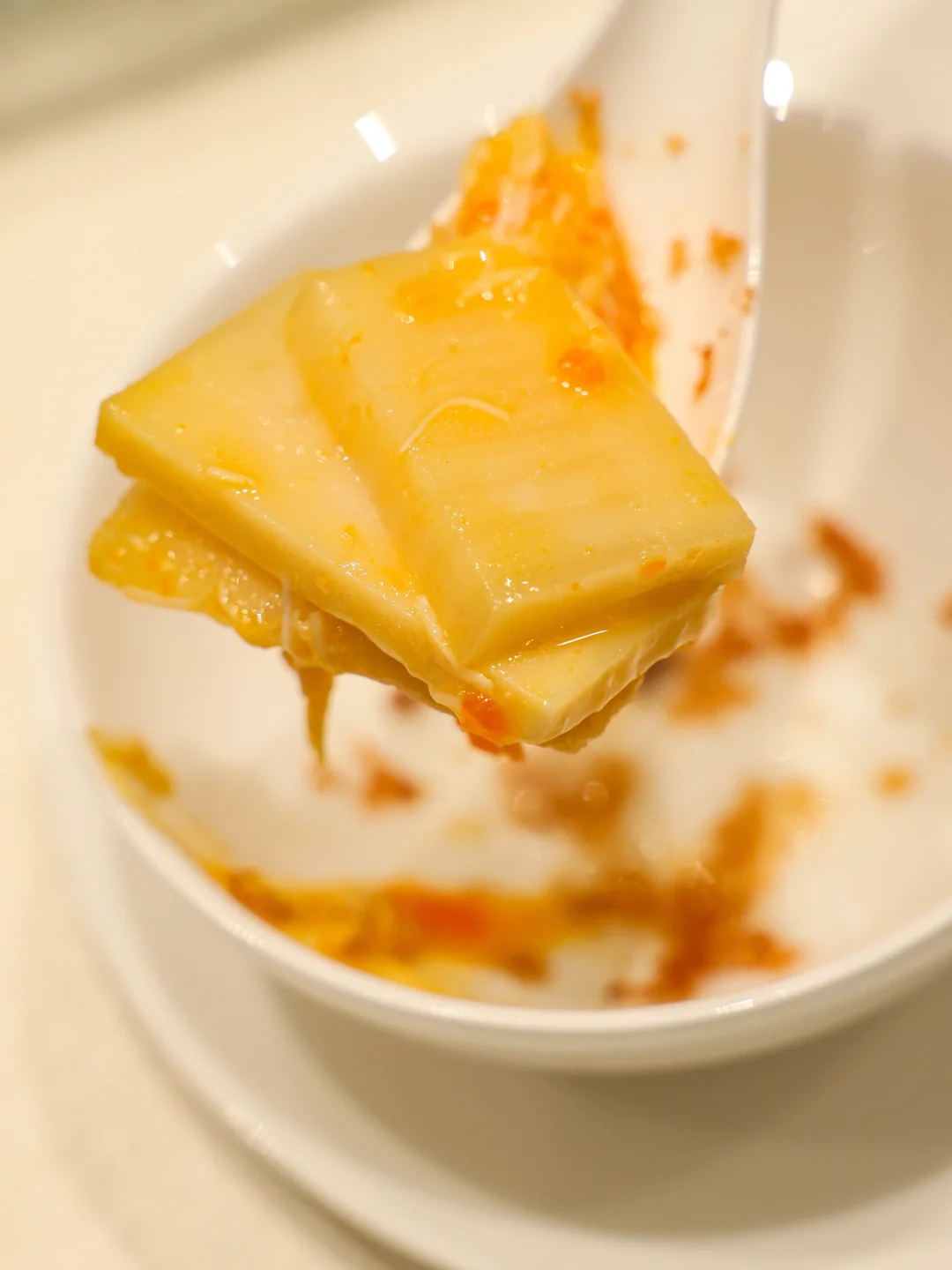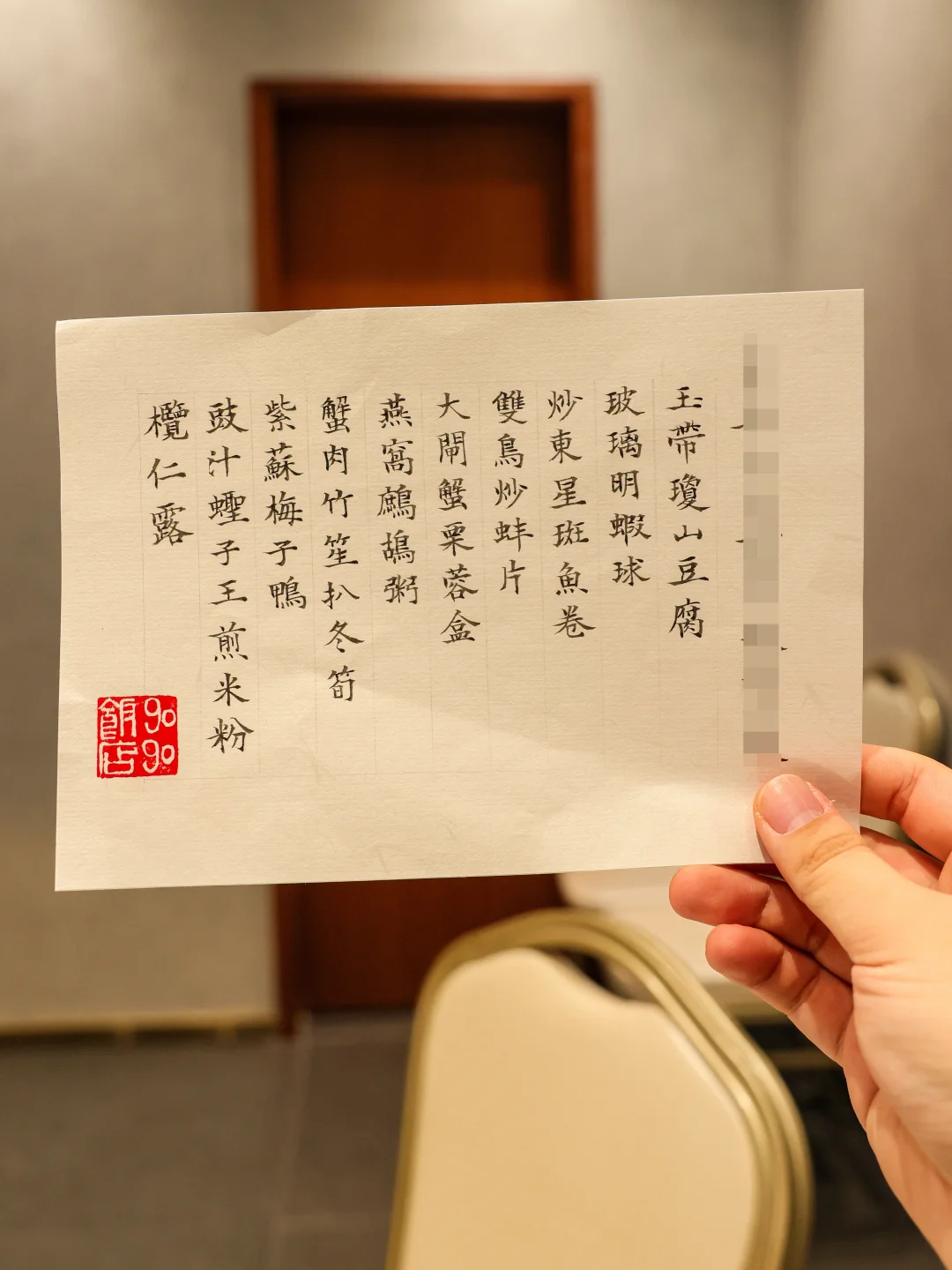 吃完就觉得很莫名其妙的一家店,没服务没特色,哪怕在古法粤菜的基础上去做创新,也让人觉得底子好像不是很牢固。 外面的大厅菜人均可能一百多,但也听说风评一般,吃个热闹吧~包厢菜是800的人均。 🧾附包厢菜单: 🫛玉带琼山豆腐 🦐玻璃明虾球 🐟炒东星斑鱼卷 🐦双鸟炒蚌片 🦀大闸蟹栗蓉盒 🐦燕窝鹧鸪粥 🦀蟹肉竹笙扒冬笋 🦆紫苏梅子鸭 🐚豉汁蛏子王煎米粉 🌰榄仁露