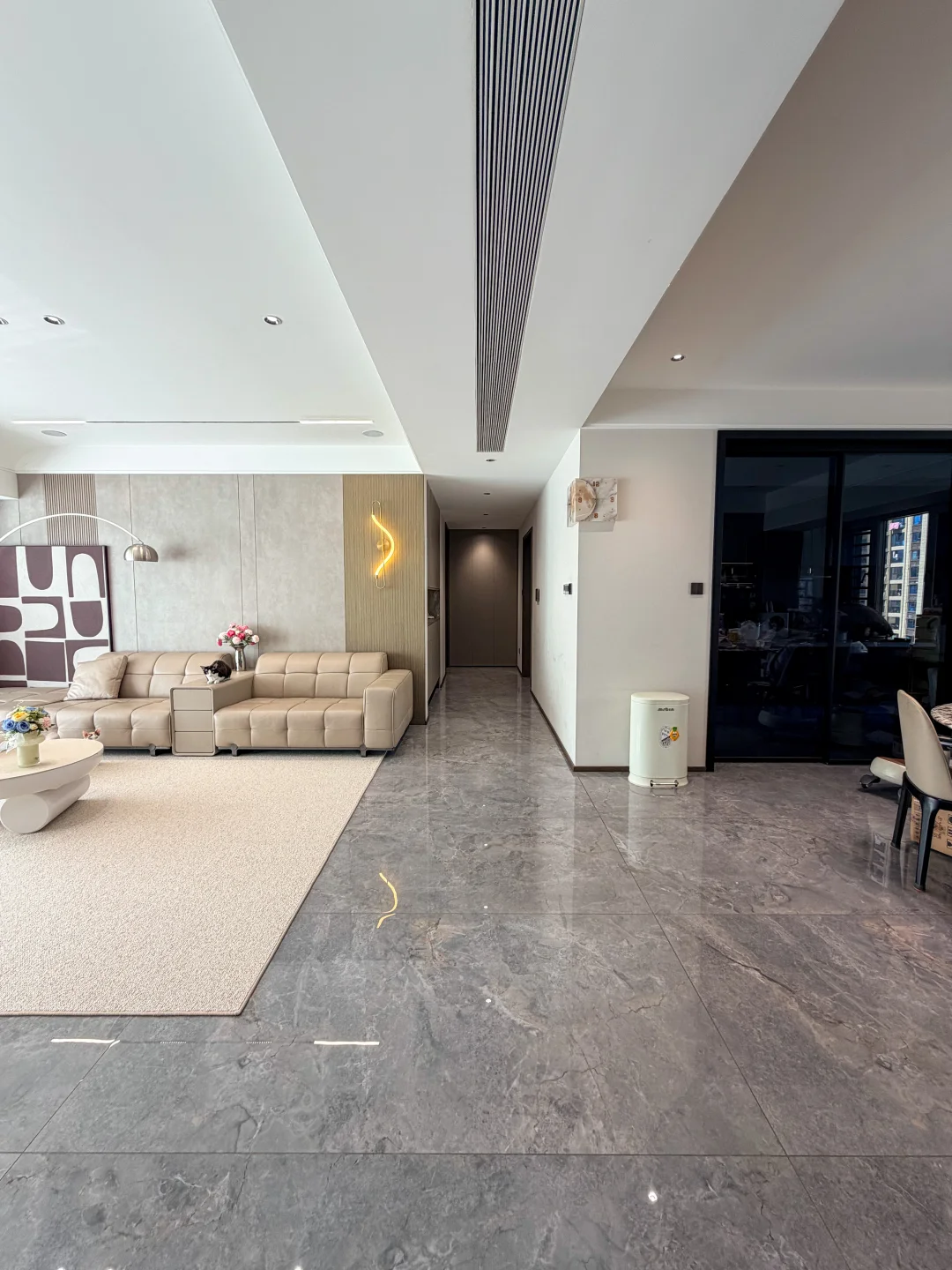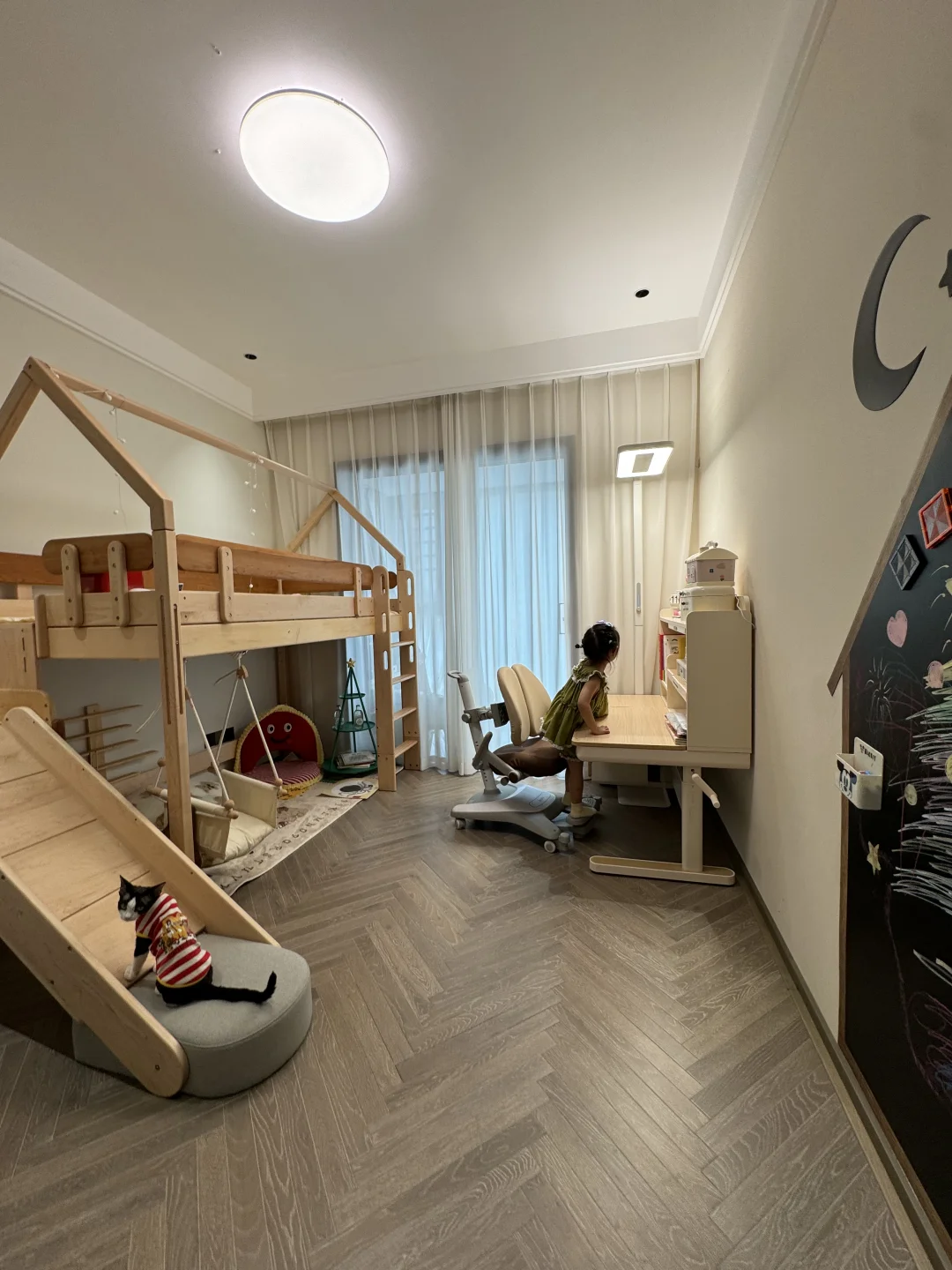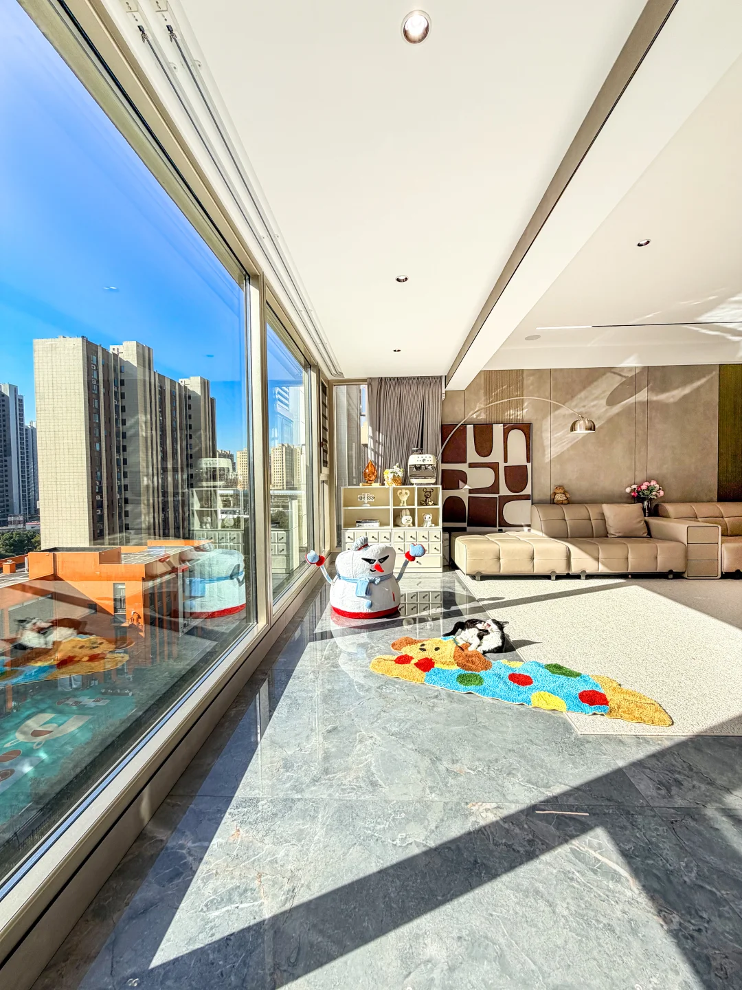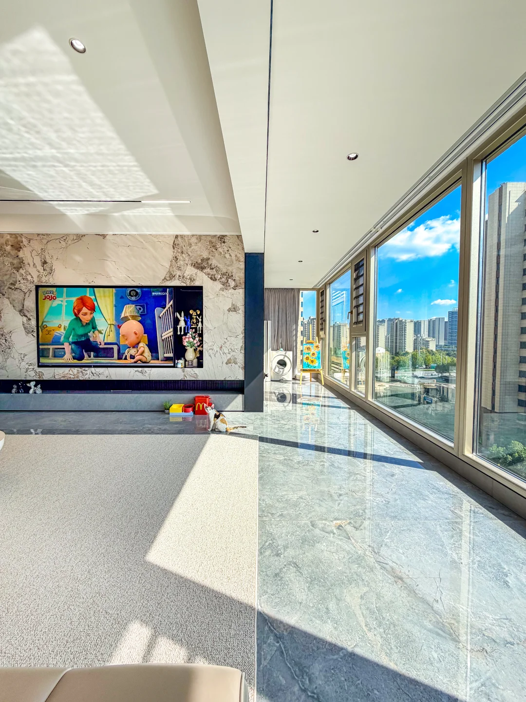被邻居挑剩下的七上八下的“八楼” 便宜了30万,被我捡漏买下了 住进来真的太舒服了 每天回到家就被窗外的树治愈了,即使是寒冬 外面窗景好美啊~ 楼层不高、没有压迫感 楼层不矮、坐在软软的沙发上刚好可以看得见外面的景色 没想到发意外收获了很多朋友的喜欢 很多朋友私信我问一些装修问题和设计 下面分享一些我的装修经验: 🏘️关于房子 建面180平,套内140平四室两厅三卫 两个阳台: 主阳台9m*1.5m、生活阳台5m*1.5m 客厅 长6.9m,宽5.1m 餐厅 长3.8m,宽4m 厨房 长5.9m,宽2.7m 儿童房长4.3m,宽3.3m 主卧 长5.8m,宽4.2m 主卫 长3.3m,宽2.75m 📚关于装修设计 现代简约风,硬装简约,配色以黑白灰为主 🌟全屋门洞加高,一门到顶更显层高,不压抑 🌟电视全嵌入,没有电线露出更整洁 🌟满墙墙餐边柜,收纳空间足 🌟厨房、卫生间选择浅灰色,耐脏,还不显暗 🌟阳台包进客厅,采光更好,空间显大 🌟硬装从简、软装搭配,后期地毯、抱枕可以增加氛围感,短毛绒地毯,好打理不藏灰 🏘️新春伊始,愿大家快乐每一天,都能拥有一个充满阳光和爱的小家
