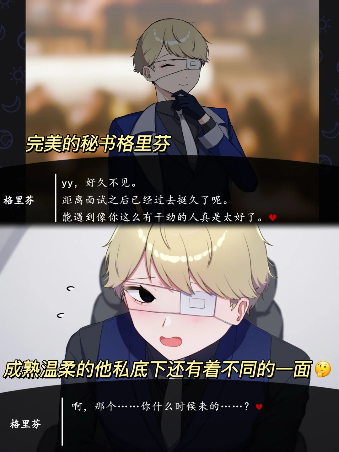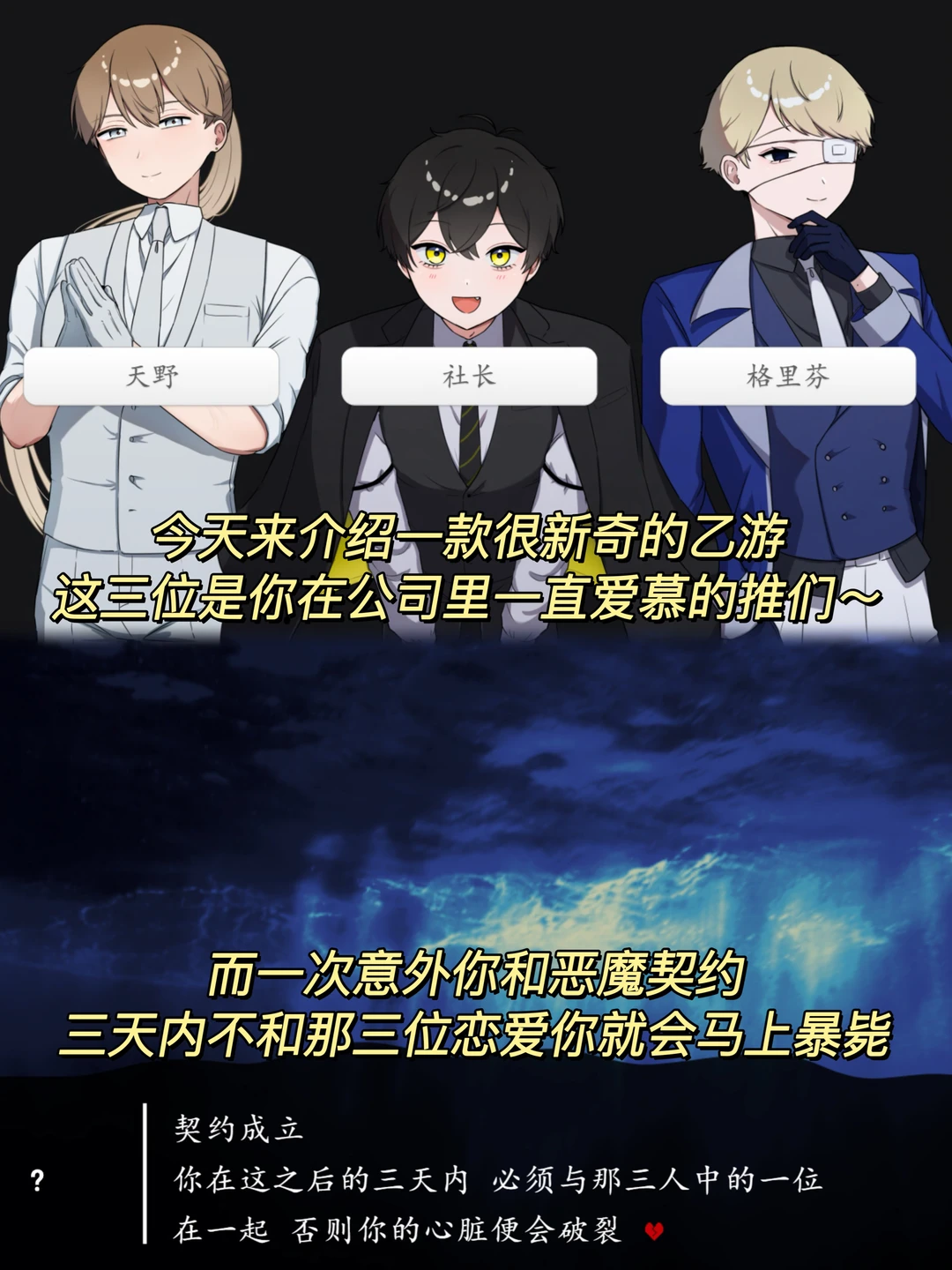 平台:2️⃣3️⃣3️⃣乐园 ✅ 不小心和恶魔签订了不平等条约,如果三天内不和自推恋爱就会当场去世,为了保命开始不断攻略自推,却发现好感度一点没涨,难道他们心中早有了心仪之人?要赶紧想办法取代他们才是… 一款偏向蔷薇向的乙游,玩家性别自由,男主们之间也有着剪不断理还乱的关系,每个人之间都有着一段难以言喻的过去,弄清那段过去也是开启真结局的必要条件~ 游戏总共有19个结局,量大管饱!喜欢的姐妹别错过了~