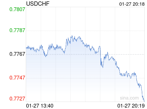新浪外汇消息2026年01月27日,截至20时18分,外汇市场上美元兑瑞士法郎汇率跌破1美元兑换0.7726瑞士法郎。跌幅为-0.5279%