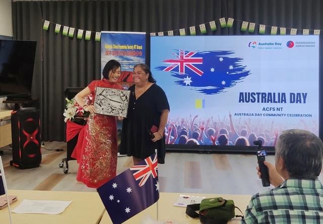 中国新年联欢会上,达尔文原住民组织向澳中友协北领地分会赠送了一幅画