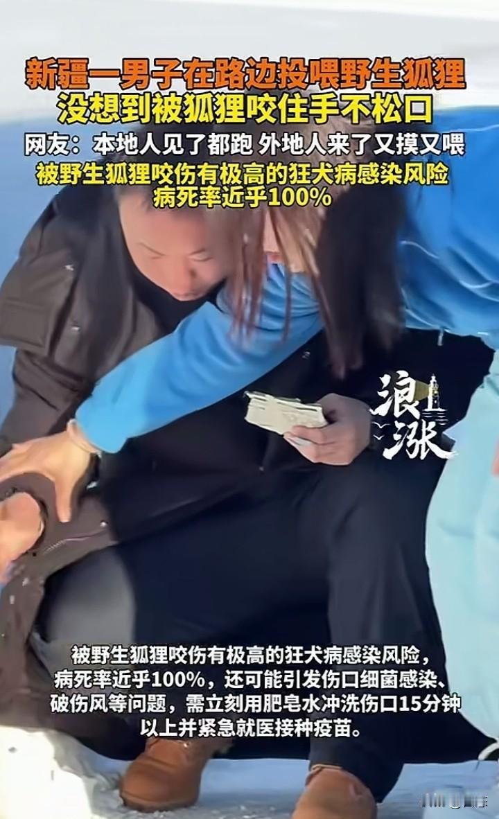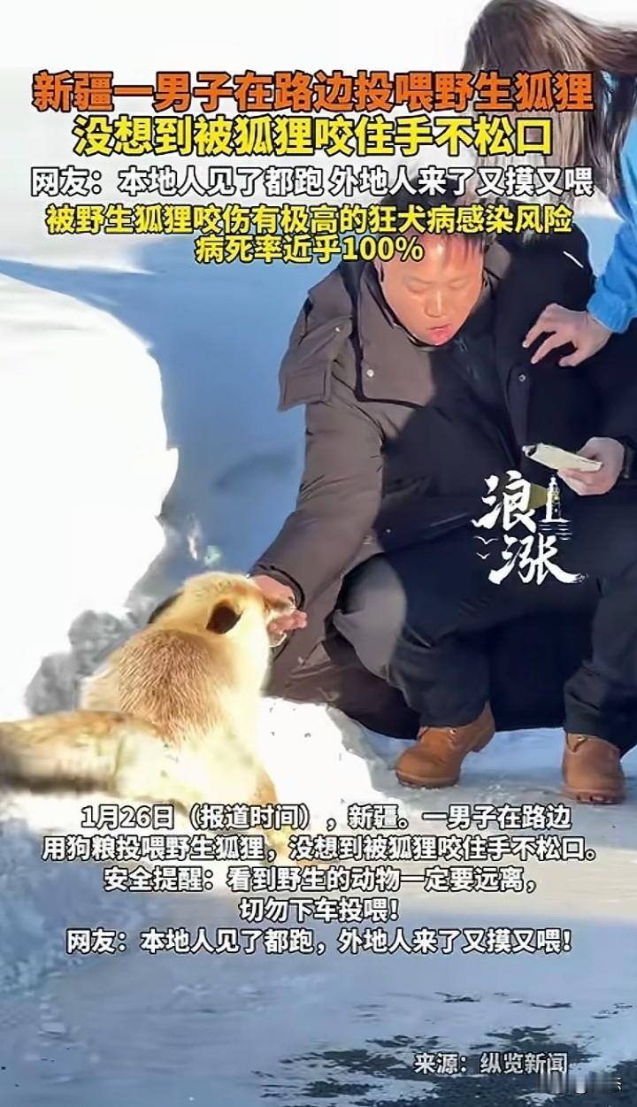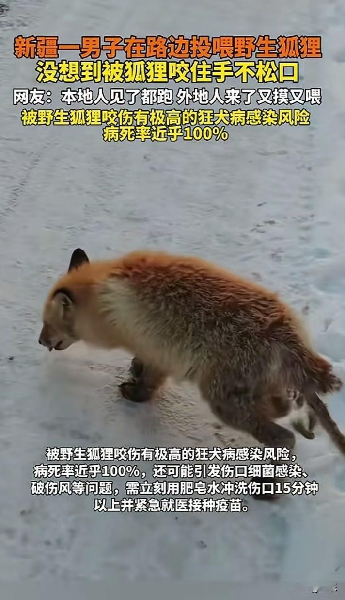 太吓人了,新疆一男子在路边用狗粮投喂野生狐狸,没想到男子被狐狸咬住手不松口。看到这着实为男子担心,有网 友称,野外的动物狂犬病毒感染风险要大的多,感染狂犬病毒,病死率接近百分之百,被咬后还有可能感染伤口等。 被咬后一定立即要用肥皂清洗伤口15分钟以上,并紧急救医接种疫苗。 在野外不管什么动物,都不要靠近,因为你不知道会不会发生意外。最好不要靠近。 希望大家引以为戒!