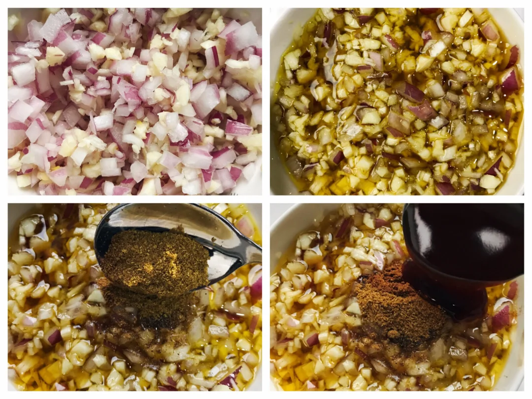 1️⃣洋葱,大蒜,切碎装入碗中备用,碗中加入适量菜籽油,刚好淹没过洋葱大蒜碎即可,再加入1勺花椒粉,1/4勺五香粉(也可不加),蚝油1.5勺,生抽2勺,盐适量(根据个人口味)。