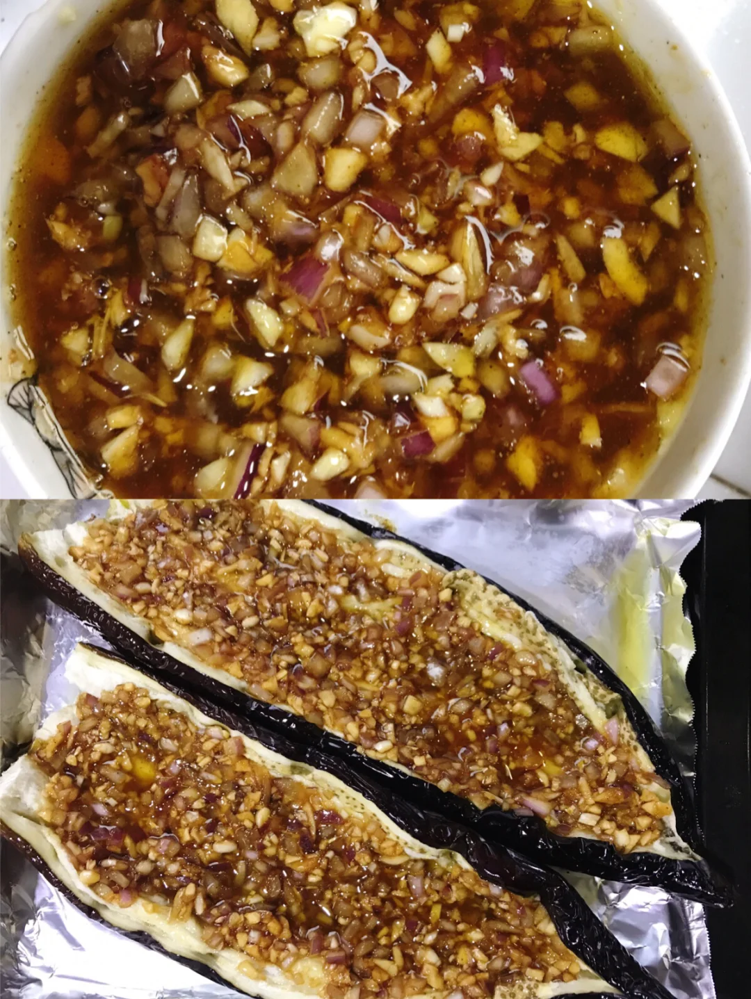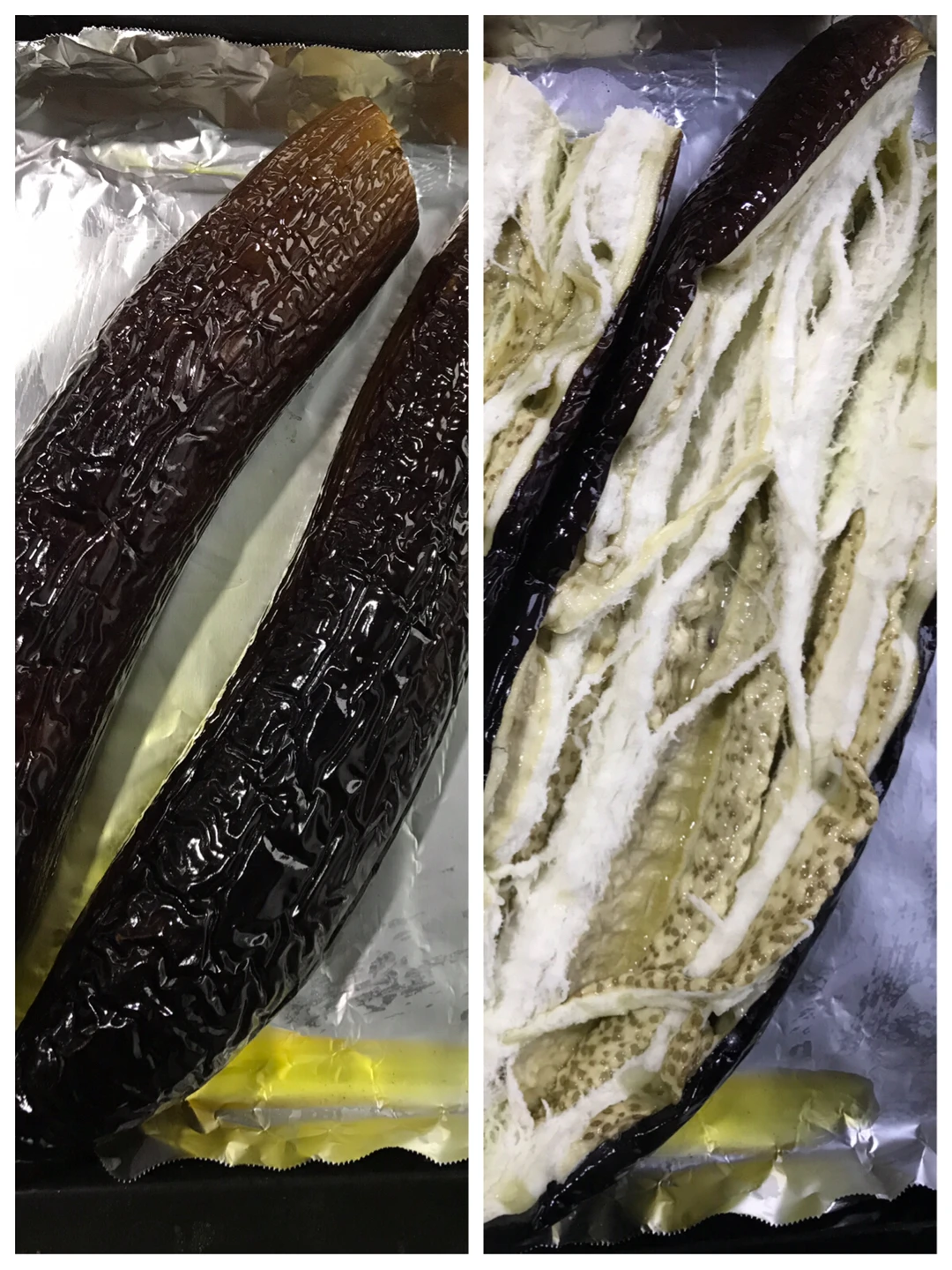 3️⃣烤至茄子变软,取出,用刀刮一条口,用筷子将茄子分开,倒入步骤1中调好的酱料。