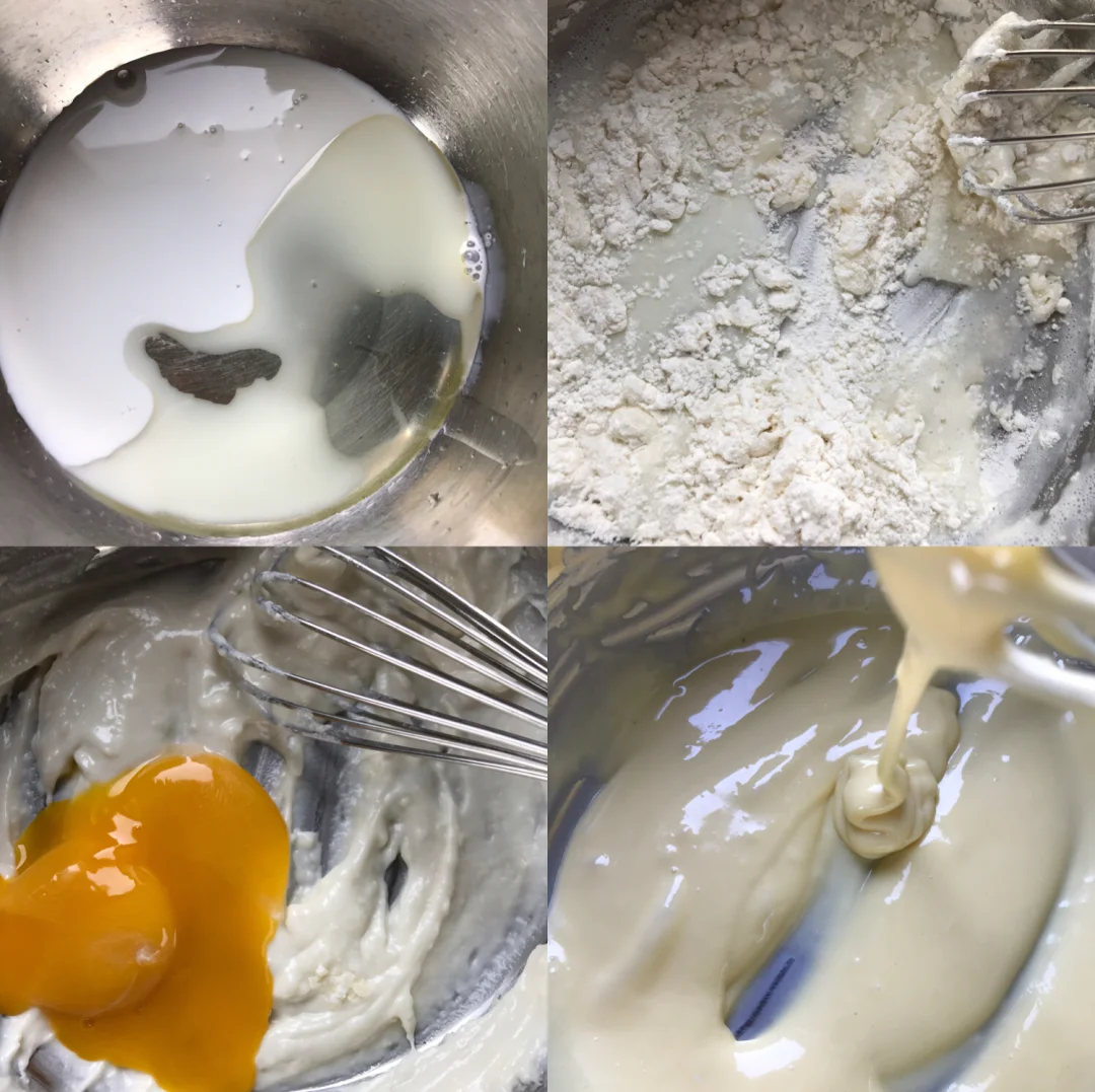 🌸牛奶跟玉米油搅拌至完全乳化。筛入低粉,划一字混匀。加入蛋黄,继续画一字(或Z字)混匀。