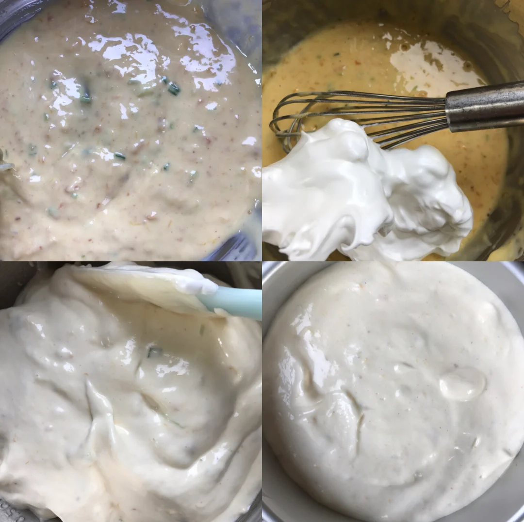 🌸将1/3蛋白霜加入到蛋黄糊中翻拌均匀,混匀后倒入剩余的蛋白霜中,翻拌均匀。