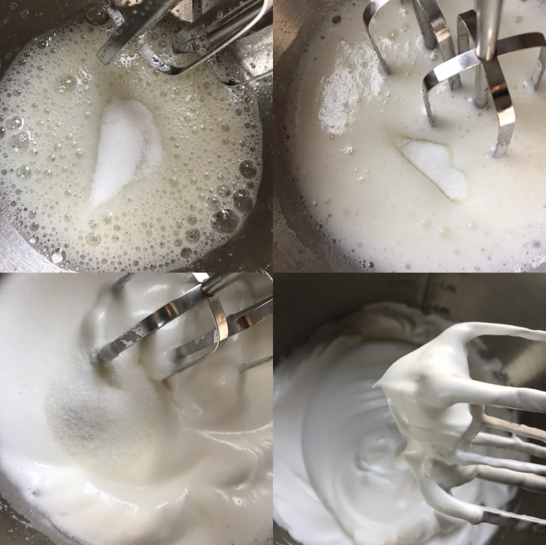 🌸蛋白中加入柠檬汁(或白醋),细砂糖分三次加入,打至提起出现小尖角。