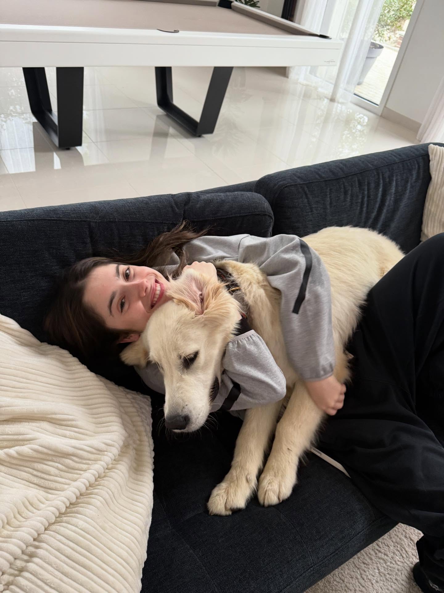虎扑01月28日讯若昂-内维斯的女友玛达莱娜更新社媒,晒出了他和内维斯共养的宠物狗子弹的照片集。