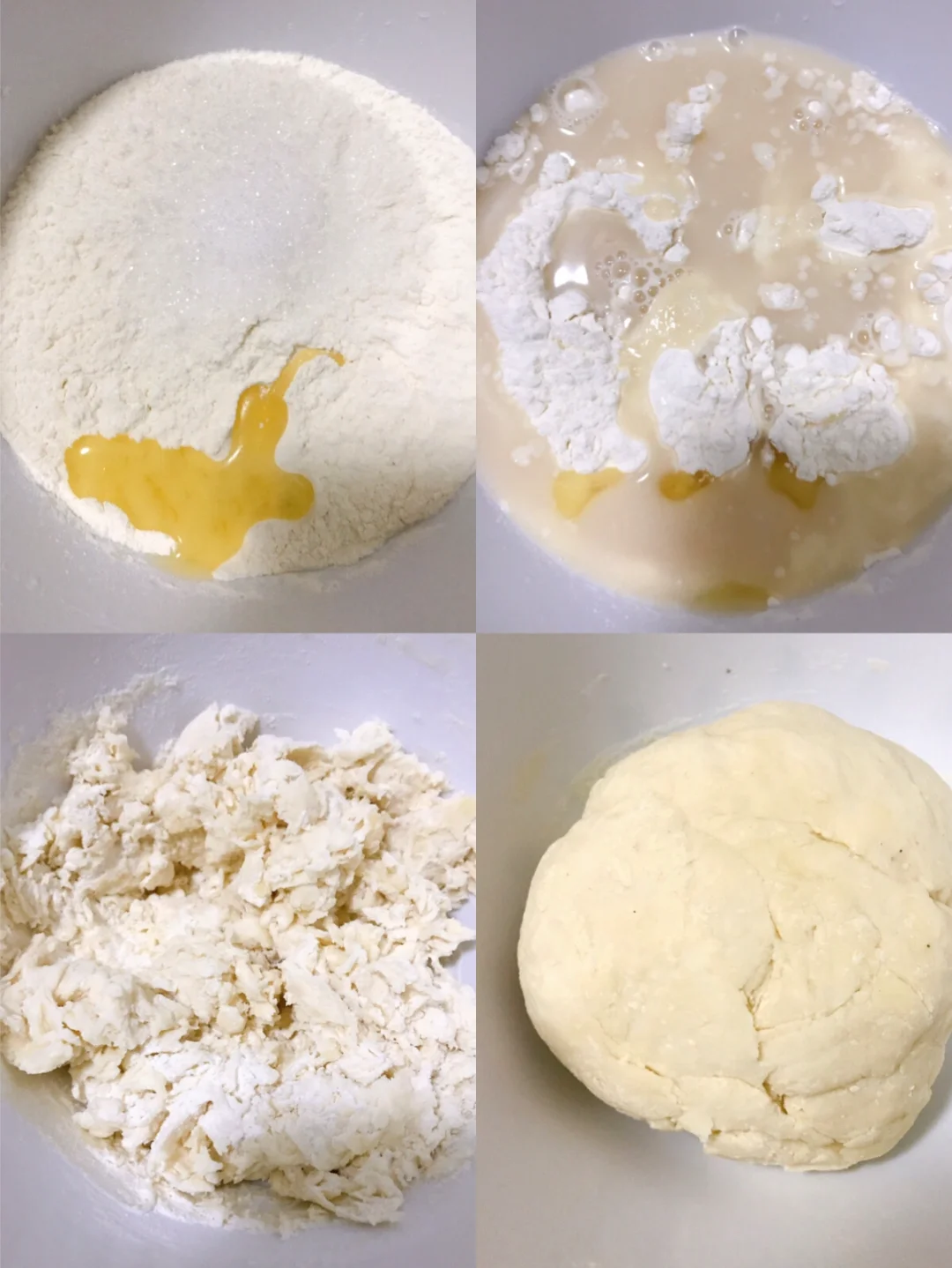 1️⃣把每个面团的所有食材全部一起放入盆内,用筷子搅拌成絮状,再用手揉成团,有压面机只需要成团就可以,如果是手揉就需要揉至表面光滑。