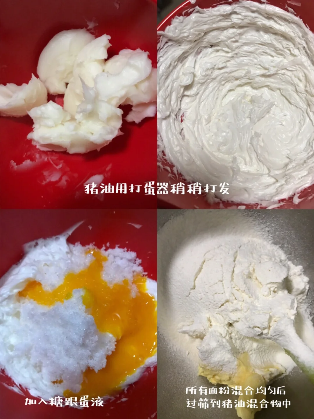 2️⃣中筋面粉,玉米淀粉,泡打粉,小苏打,盐全部混合均匀过筛到猪油混合物中,将所有材料混合均匀看不见干粉,成为一个面团。