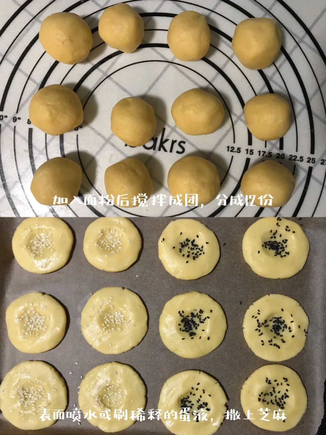 4️⃣表面喷一层水或者其他一点点稀释的蛋黄液,(我的蛋液稀释太多了,所以也看不出来颜色~)撒上自己喜欢的芝麻。
