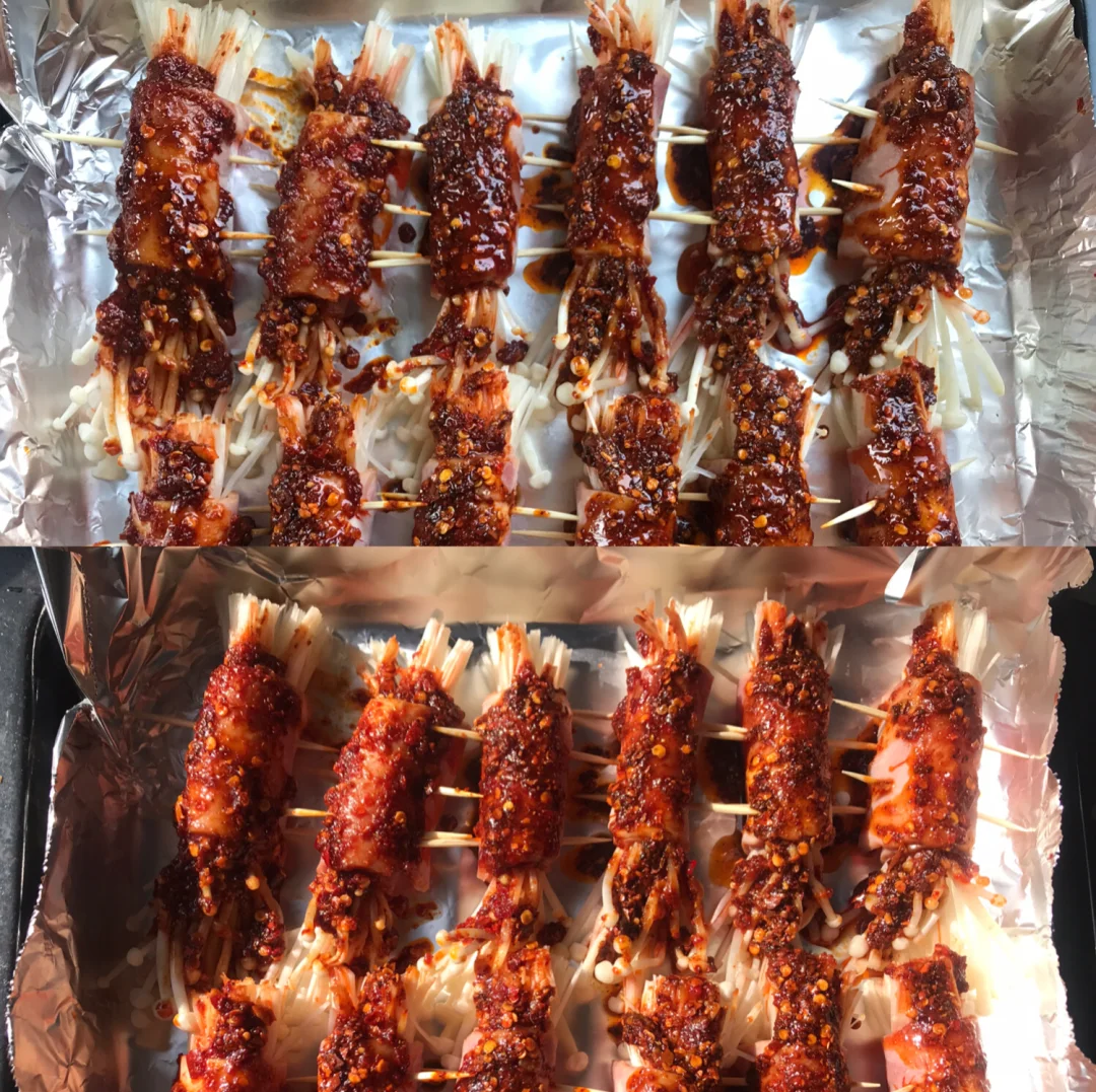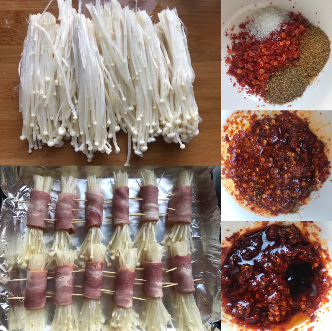 ⚠️因为培根本身比较咸,所以我只加了生抽跟蚝油调味。金针菇在烤的时候会出水分,中途可以取出来倒掉,这样可以节省时间,也更好吃!