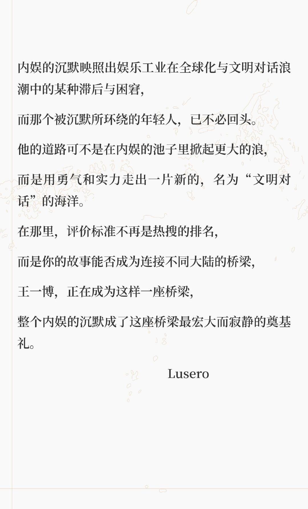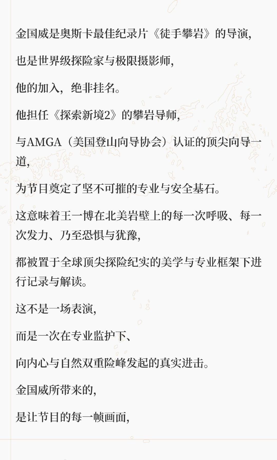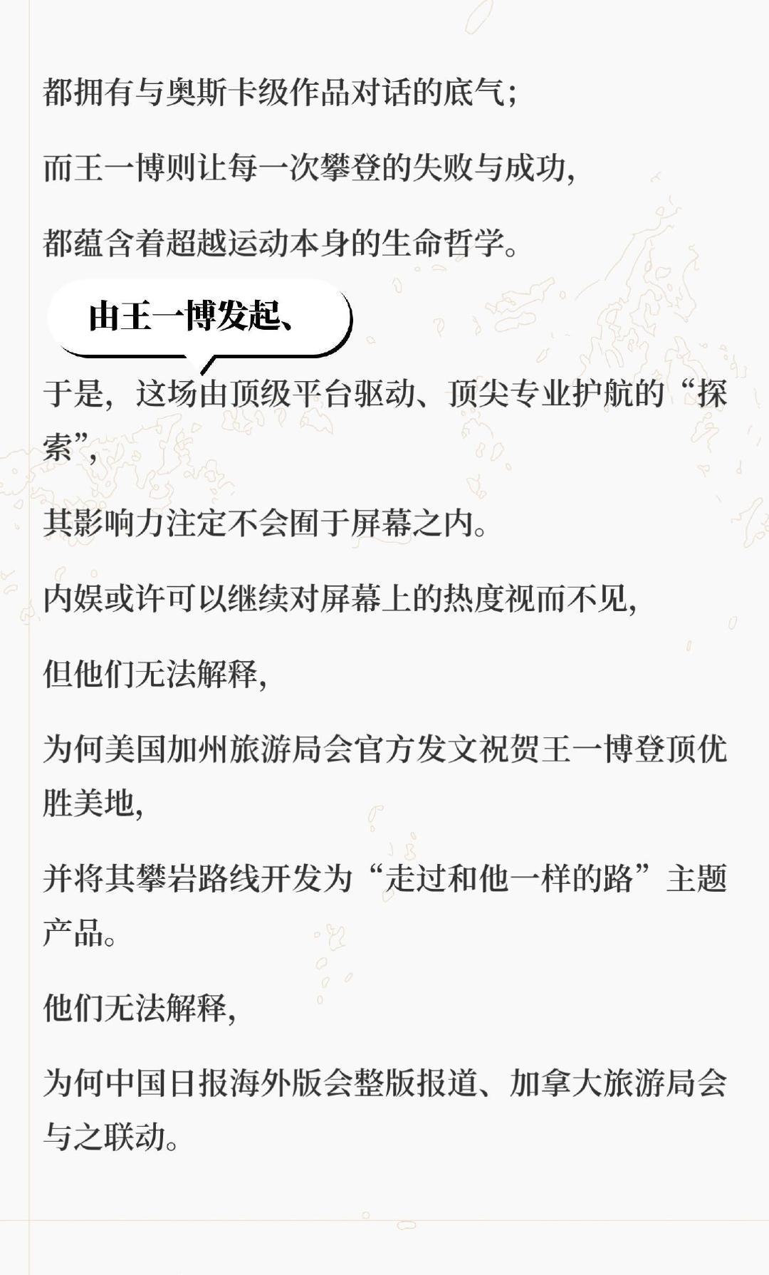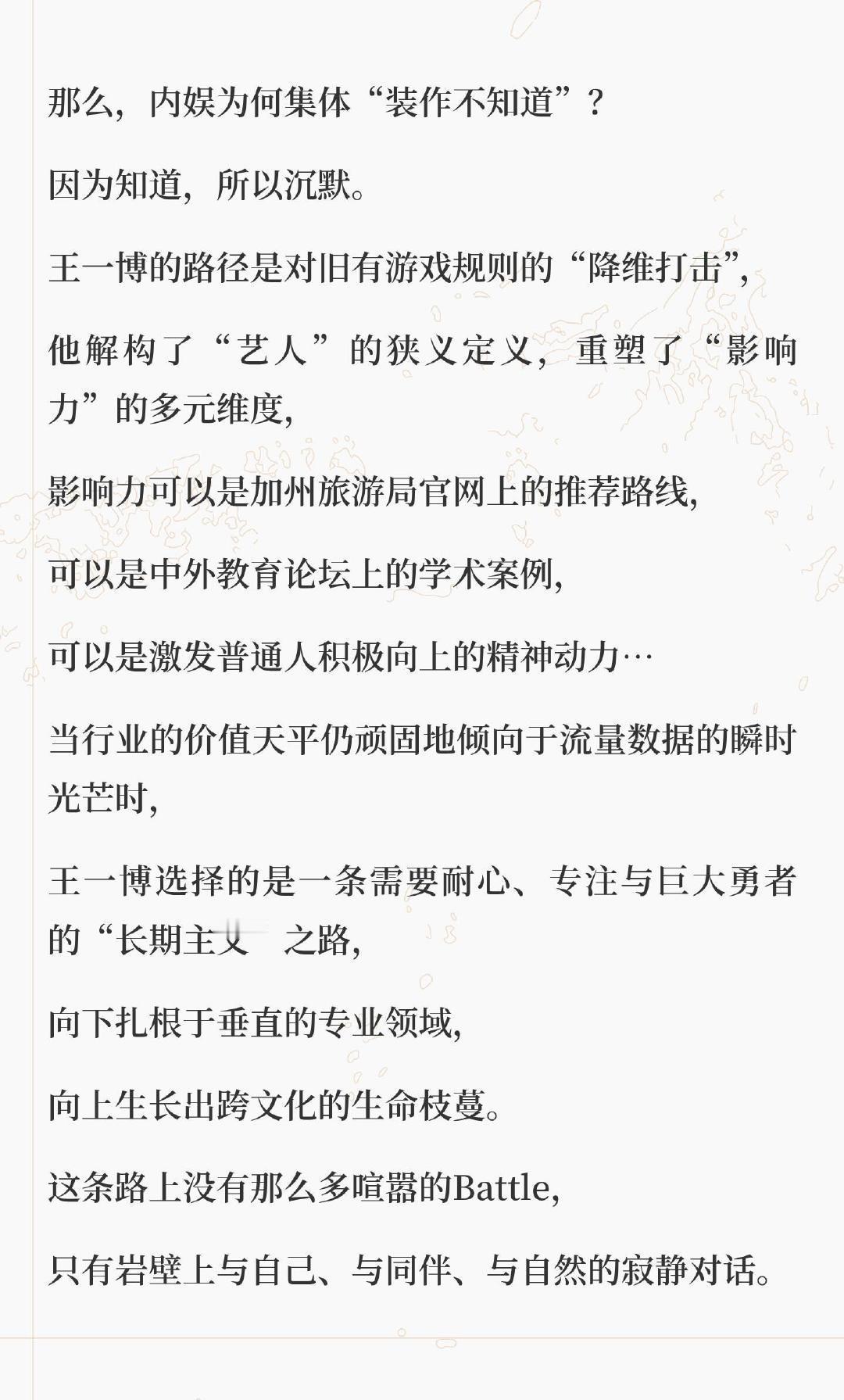 🍠上的一篇特别值得一读、总结的特别好的关于王一博纪录片《探索新境2》的宣传安利文,高赞! 文章题目直击——整个内娱都在装作不知道,王一博的《探索新境》有多高级。 “这种集体沉默,正是因为他们心知肚明,王一博的《探索新境》所抵达的维度,已是内娱现有游戏规则无法定义更无力企及的天花板。” “王一博探索新境的故事,就是当代中国青年直面挑战、寻求自我、连接世界的青春叙事先锋,王一博是展现可信、可爱、可敬中国青年形象的鲜活载体。” “王一博选择的是一条需要耐心、专注与巨大勇者的“长期主义”之路,向下扎根于垂直的专业领域,向上生长出跨文化的生命枝蔓。这条路上没有那么多喧嚣的Battle,只有岩壁上与自己、与同伴、与自然的寂静对话。” 那么,内娱为何集体“装作不知道”? 恰恰因为知道,所以沉默…… 诋毁你的人永远比任何人都知道你的清白,拉踩你的人永远比任何人都清楚你的优秀。 他们不沉默不“装作不知道”,还能怎样呢? 王一博 王一博探索新境2