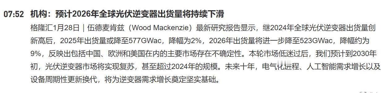 光伏逆变器看来近期是必须要避开了,难怪阳光电源近期走的如此弱势,原来有利空! 根据伍德麦肯兹的研究报告,继2024年全球光伏逆变器出货量创新高后,2025年出货量或降至577GWac,降幅为2%,2026年出货量将进一步降至523GWac,降幅约为9%,反映出包括中国、欧洲和美国在内的主要市场存在不确定性。 光伏逆变器销量开始走低,这无疑对于阳光电源等光伏逆变器厂家而言是利空的事情。 前些年,全球光伏各种抢装,带来了阳光电源等逆变器厂家业绩的大增。现在光伏装机基本已经到了瓶颈,特别是老美取消新能源补贴后,这一块的市场开始明显下滑。 现在我们这边也取消光伏的出口退税了。 这意味着这两年逆变器大概率是不好卖了。难怪近期A股涨势这么好,阳光电源却反而不断走低,是有深刻的现实原因的。