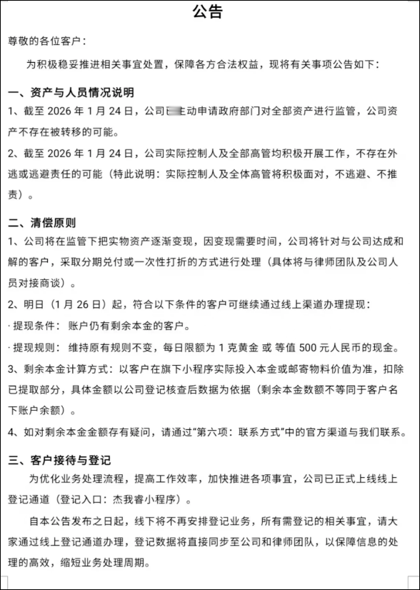 1月24日,平台负责人张某曾通过视频安抚投资者,称以“官方小程序首页弹窗为准”。次日,杰我睿公告称,已主动申请政府部门对全部资产进行监管,并强调资产未被转移,并将每日兑付金额限定为1克黄金或等值500元现金,具体处置方案仍需协商,预计需7至15天方可处理。