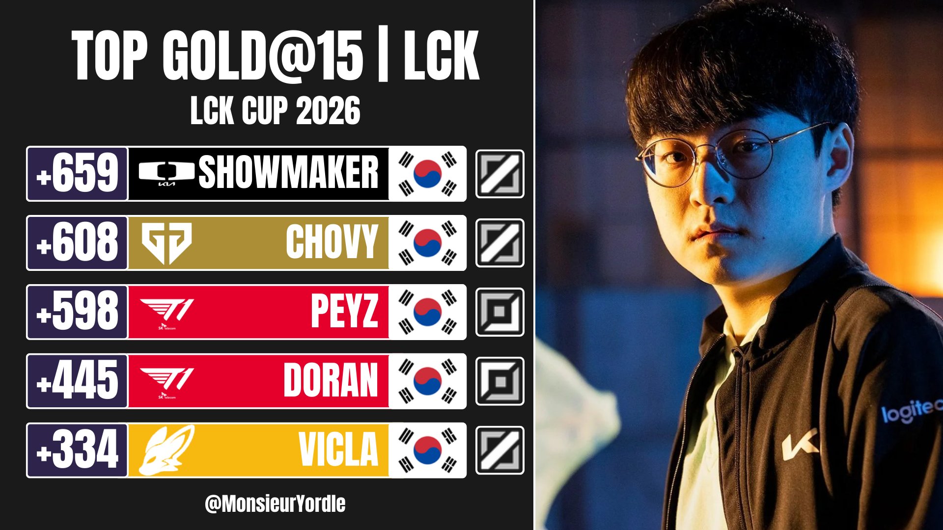 2026LCK杯前15分钟对位经济差:ShowMaker位居第一