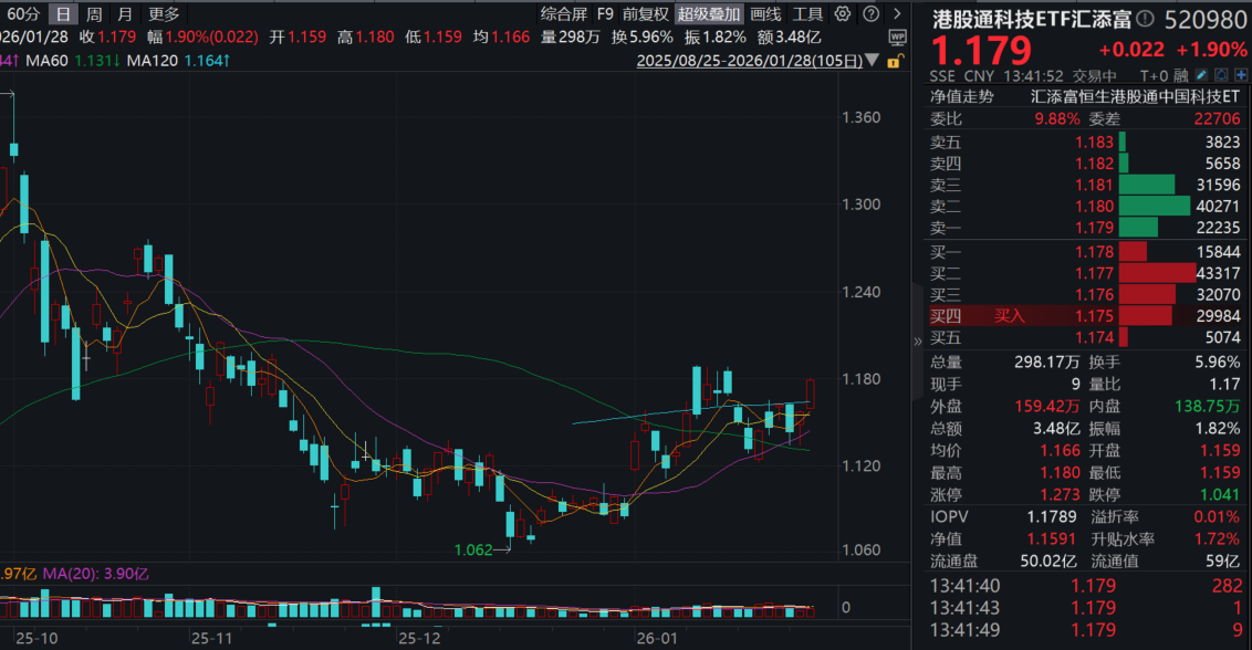 今日(1.28),港股科技午后大涨,100%纯度的港股通科技ETF汇添富(520980)涨近1%,成交额超3.6亿元!资金已连续3天大幅涌入,累计“吸金”超4.8亿元!