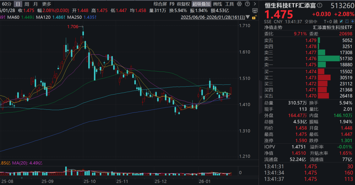 同类唯一15BP最低档管理费的恒生科技ETF汇添富(513260)亦涨超2%,盘中成交额已超1亿元!资金面上,恒生科技ETF汇添富(513260)近5日累计“吸金”超1.2亿元!基金最新融资余额超1.5亿元,最新规模超76亿元!