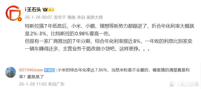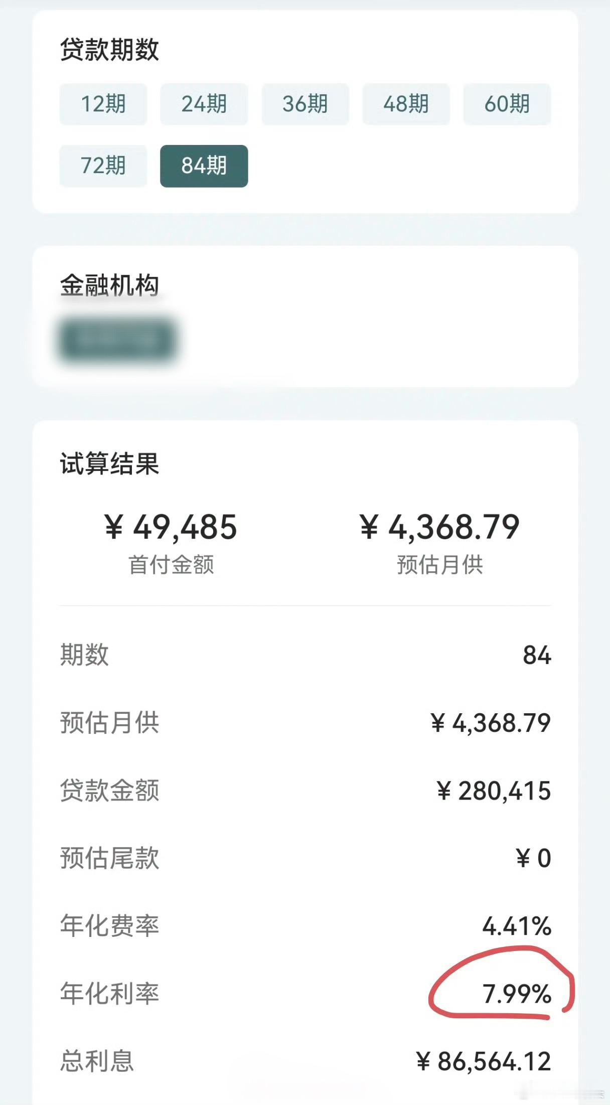 我发现这群人就喜欢编造。我说有品牌搞7年分期,综合年化利率接近8%,我说的是有数据支撑的。试算结果展示得清清楚楚,贷款280415元,月供4368.79元,分84期总共要还将近36.7万,多出来的这部分就是利息。这条评论说小米七年低息综合年化率达7.86%,请问是怎么得出的结论?25.35万元的车,首付4.99万元,贷款203600元,分84期,月供2593元,总共要还217812元,7年多付14212元利息。就这种脑子,我只想说,你不当韭菜谁当韭菜?难不成让我当韭菜?