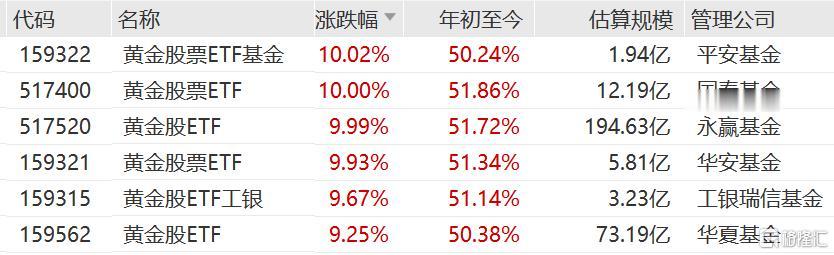 黄金股票ETF基金、黄金股票ETF、黄金股ETF罕见涨停,年内涨超50%。
