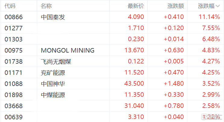 煤炭股上涨,中国秦发涨11.14%,兖矿能源涨4.25%,中国神华涨3.52%,中煤能源、兖煤澳大利亚涨超2%。