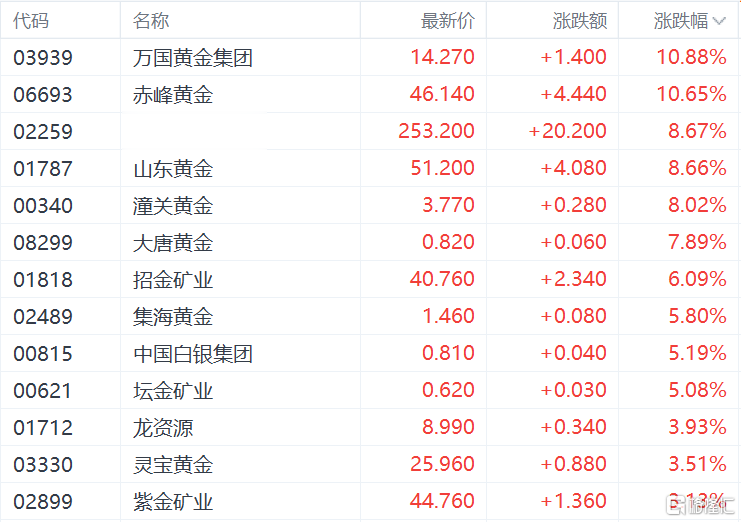 黄金及贵金属股走强,万国黄金集团、赤峰黄金涨超10%,紫金黄金国际、山东黄金、潼关黄金涨超8%,大唐黄金、招金矿业、坛金矿业、灵宝黄金、紫金矿业跟涨。