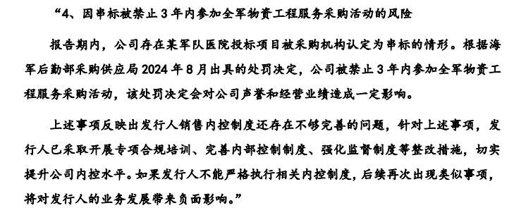 根据问询回复公告,美康股份因在军队医院某投标项目中存在“串通投标”行为,被禁止在3年内参加军队采购活动,禁入期限直至2027年8月。尽管美康股份在问询中强调该中标项目金额仅125万元、结果已作废且军队业务收入占比仅1%-2.4%,试图淡化影响,但对一家拟上市公司而言,信用成色远比业绩贡献更关键。